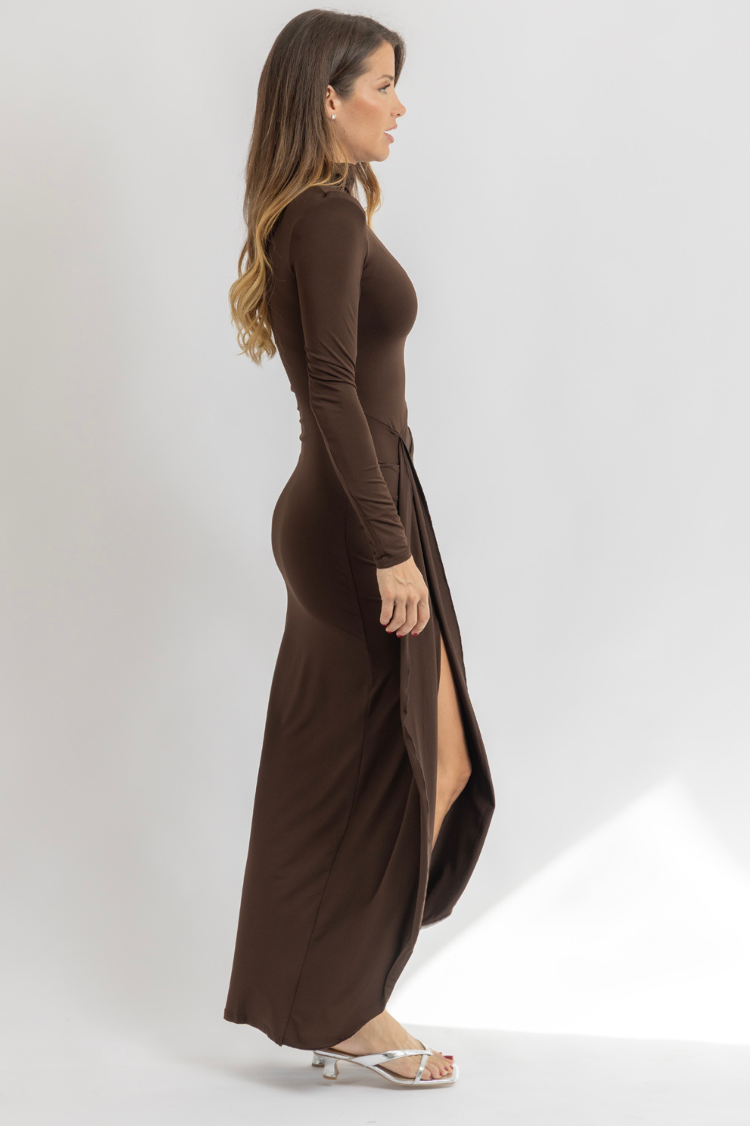 Maxi length, Mock neckline, Long sleeves, Ruched front detail with high side slit, Form fitting with some stretch
