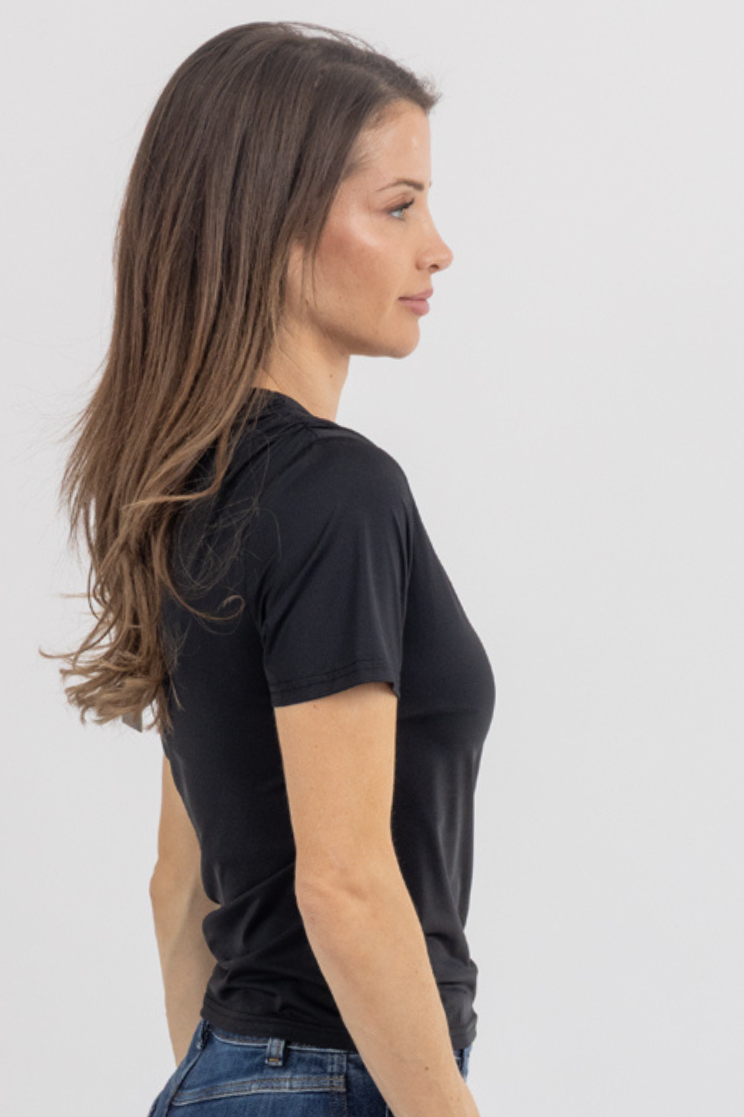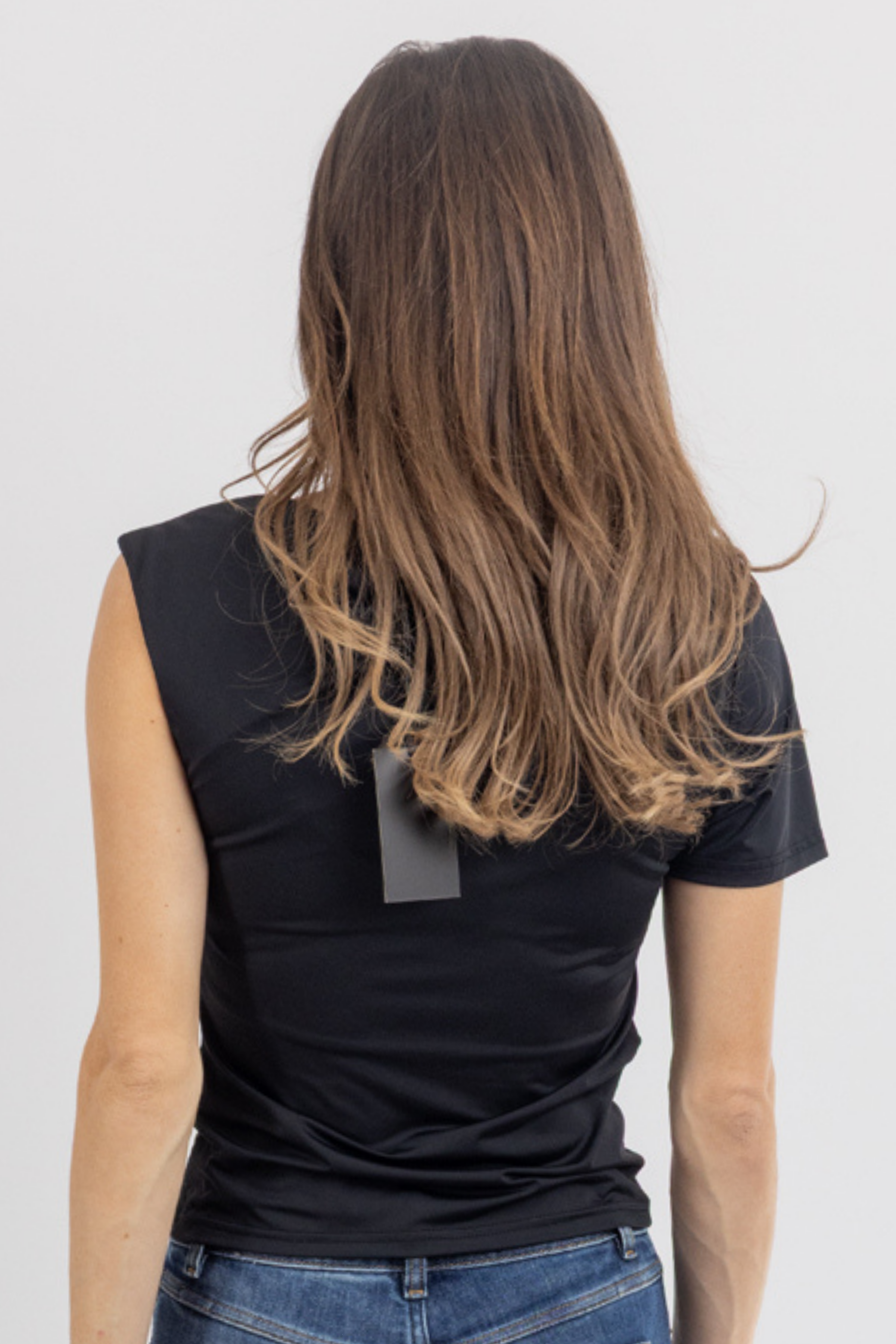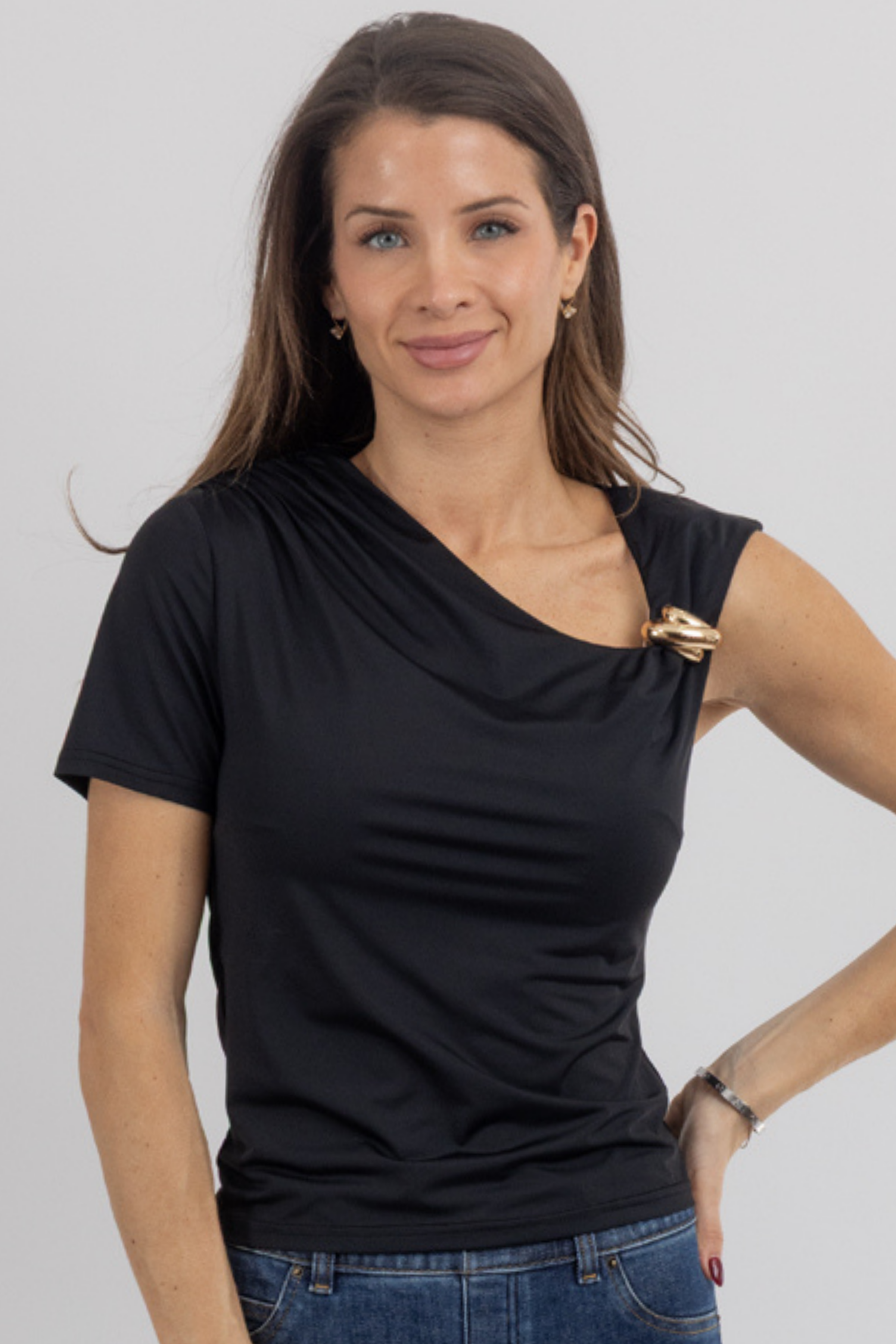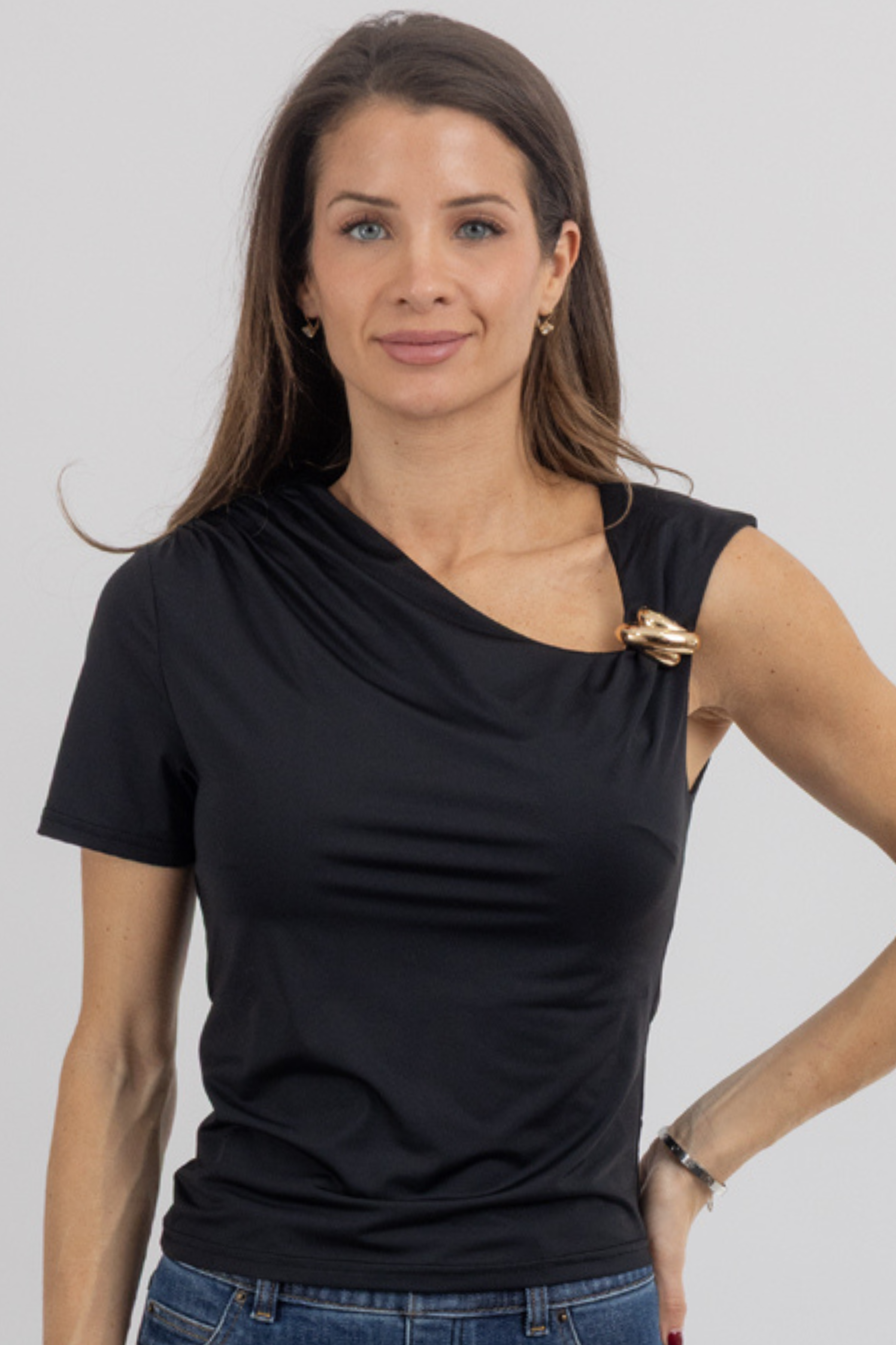 Asymmetric neckline with gold ring detail, One sleeve, Shirred detail, Soft jersey feel, Fitted with some stretch