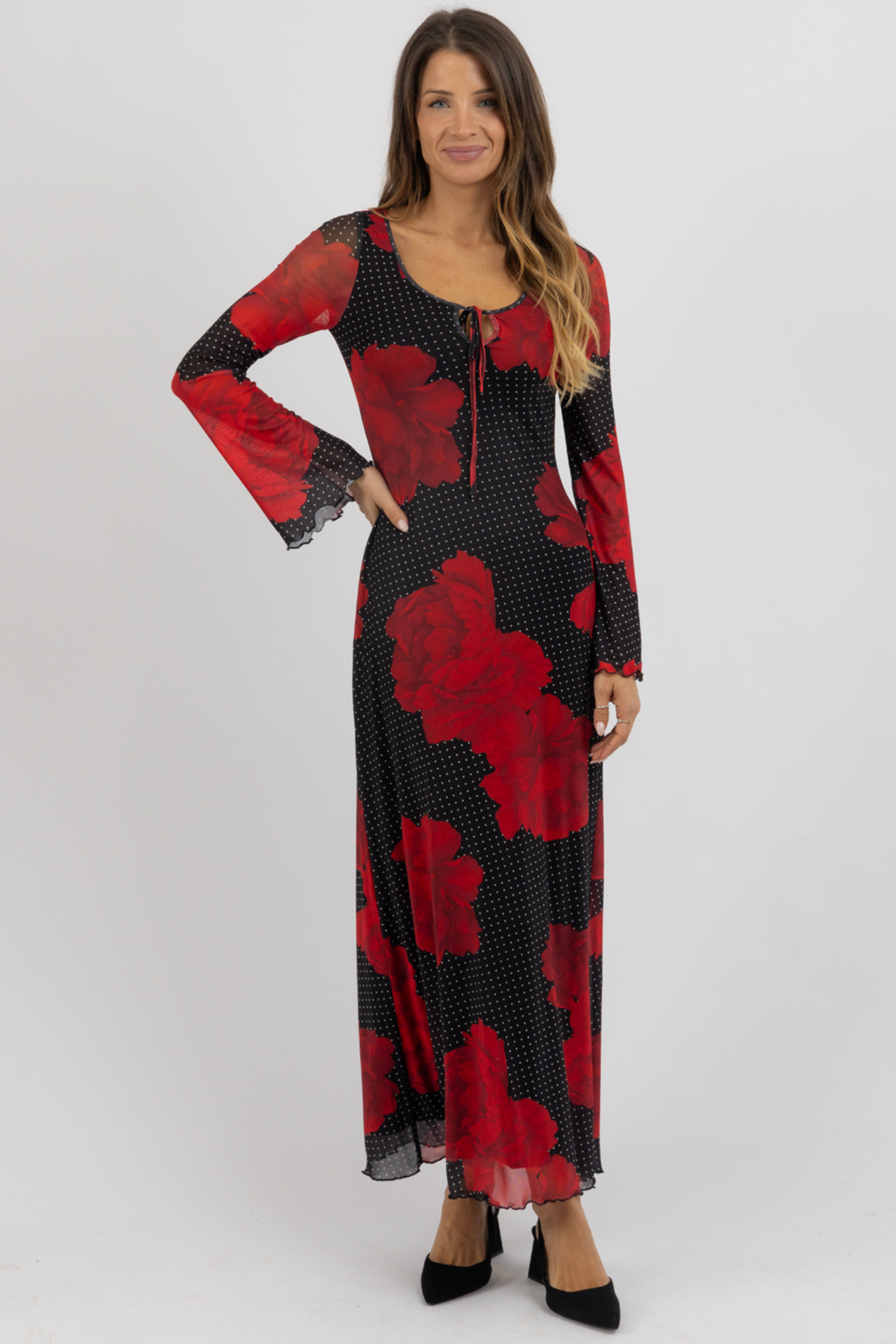 NUDE OFF SHOULDER RUFFLE + TIE WAIST MAXI DRESS