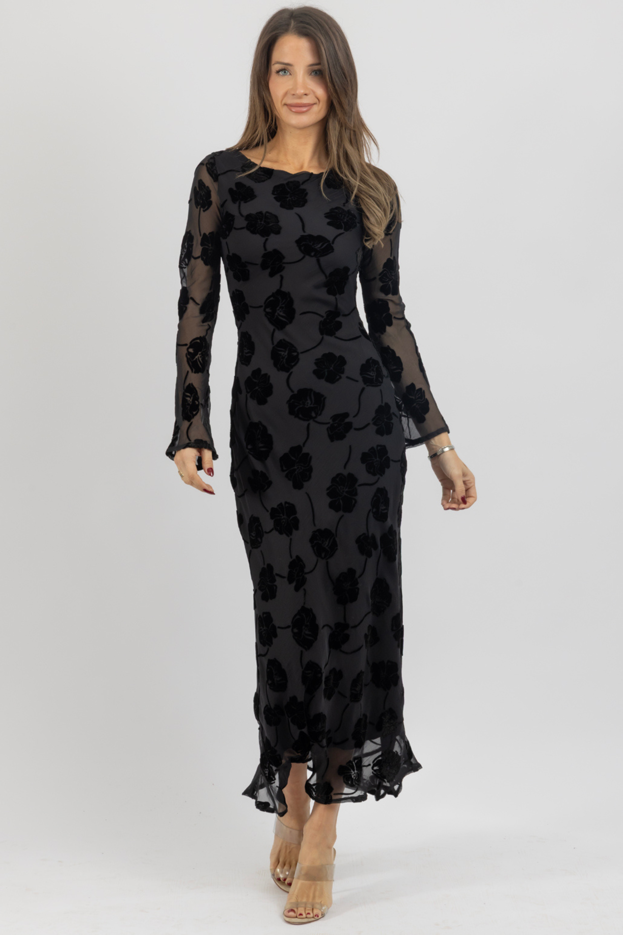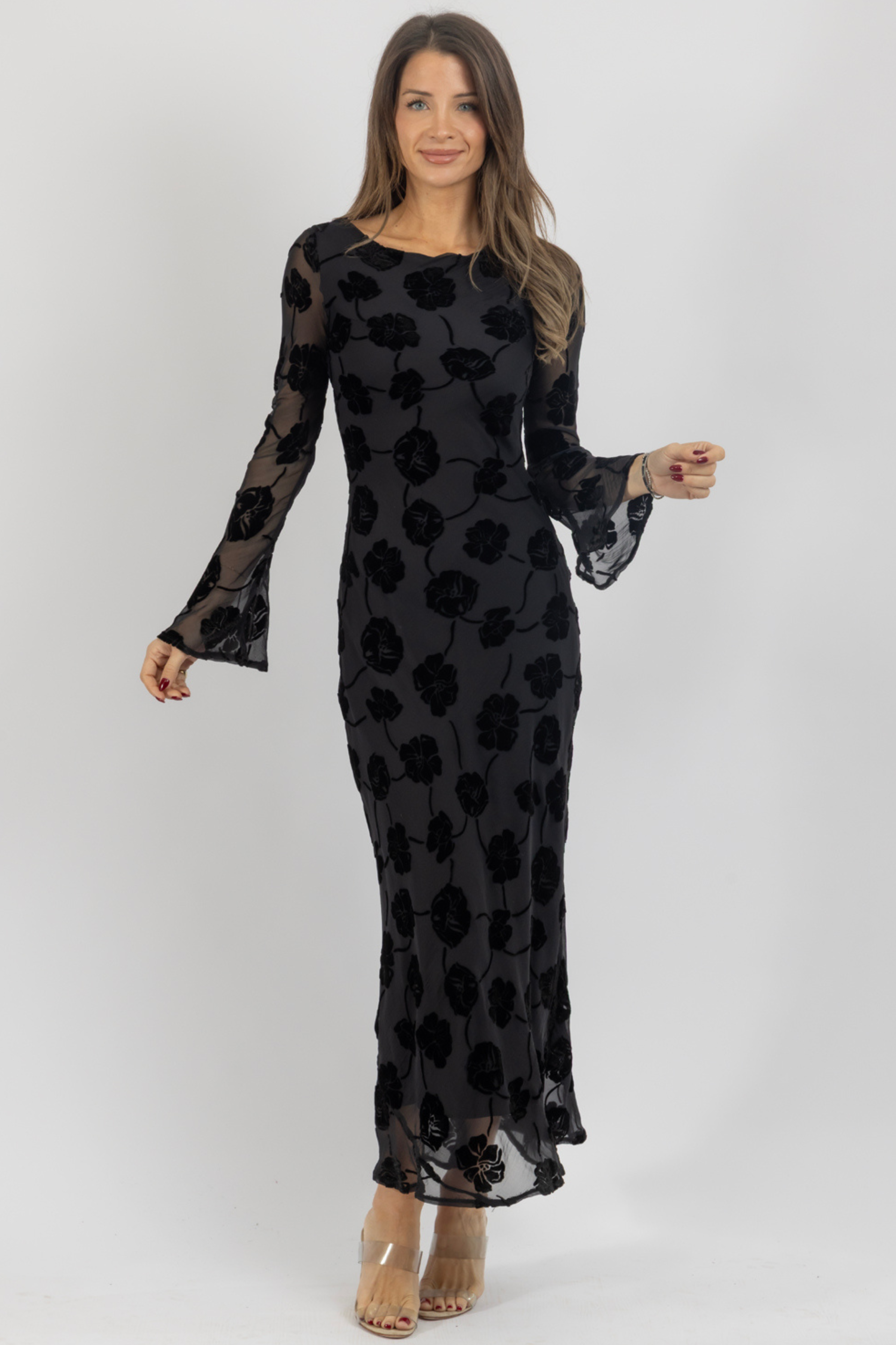Long sleeves, Maxi dress, Floral print with velvet burnout detail, Flare sleeves, Satinlike