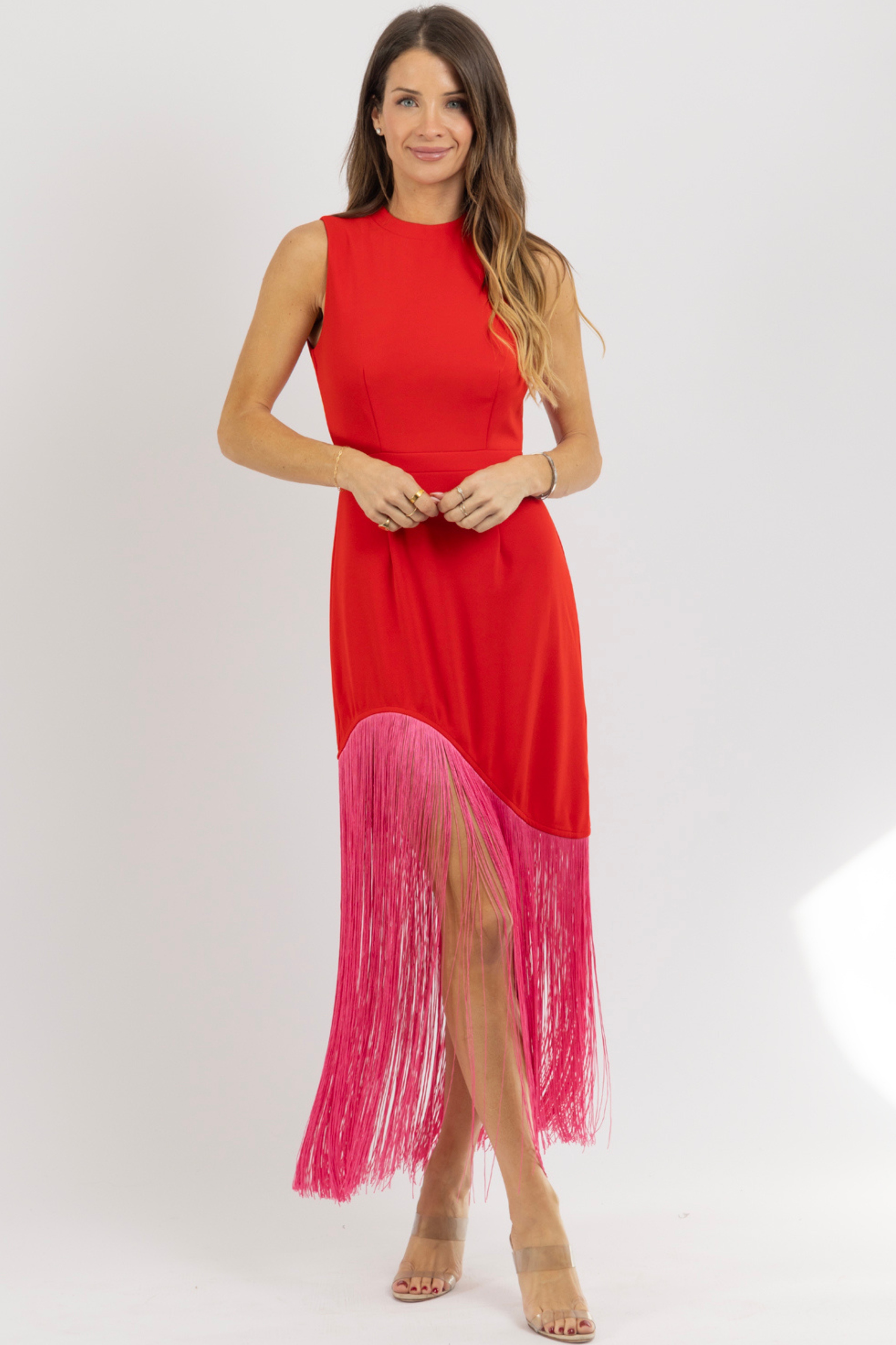 Maxi length, Contrast fringe hem, Sleeveless, Mock neck, Invisible back zippered closure