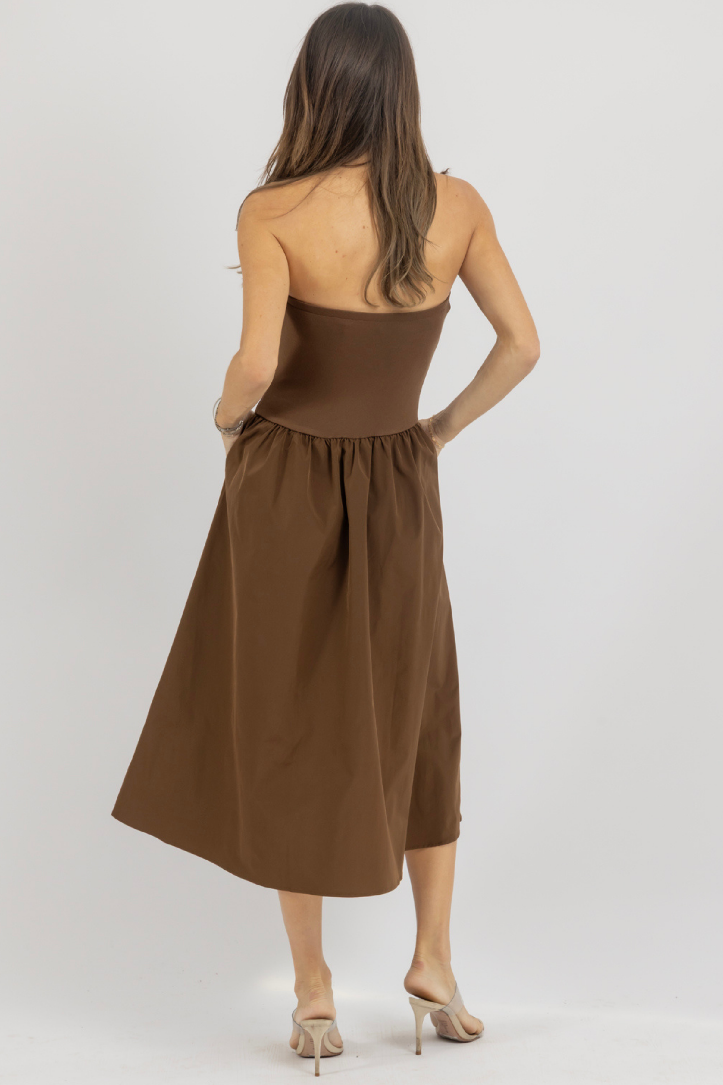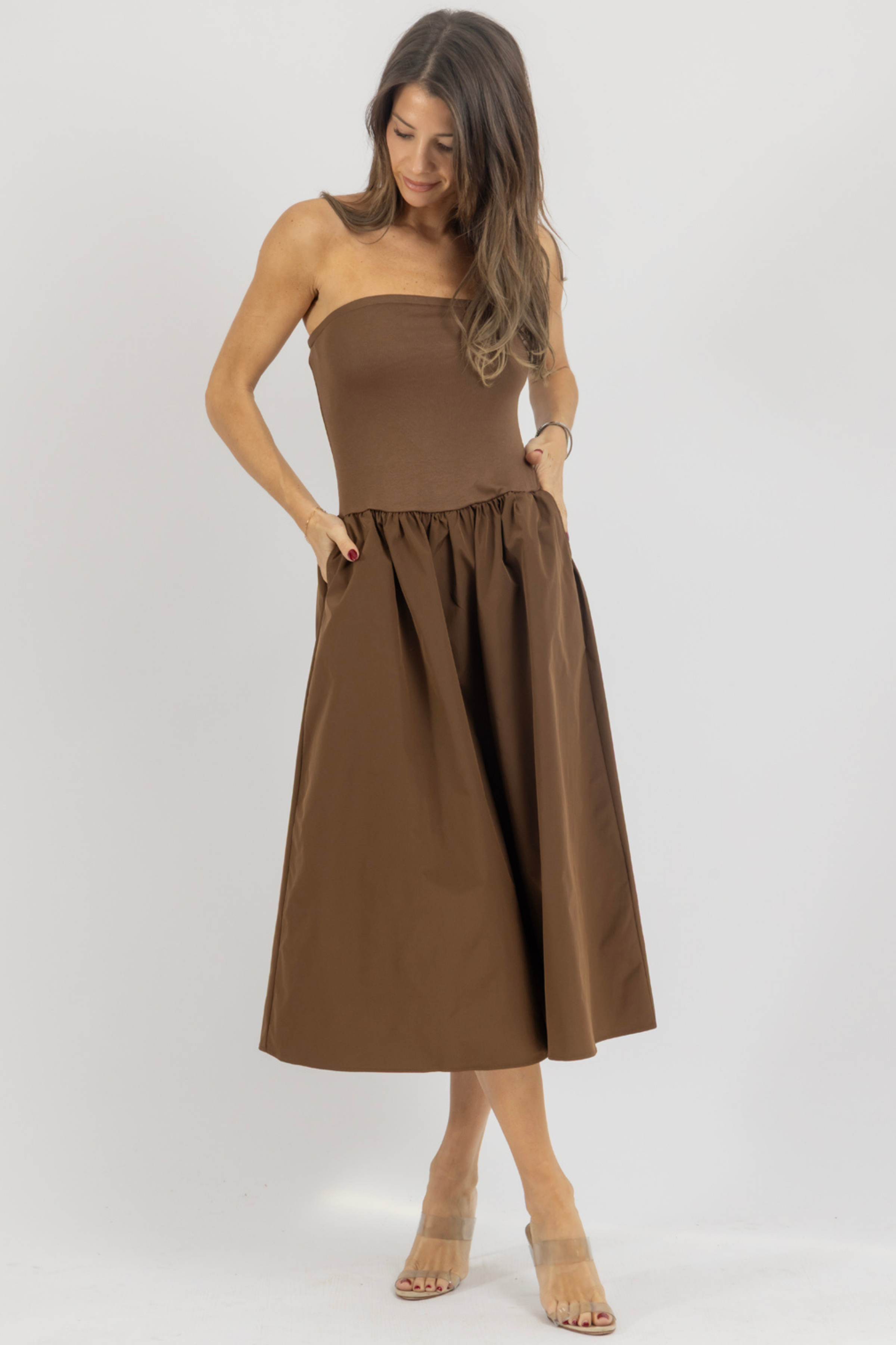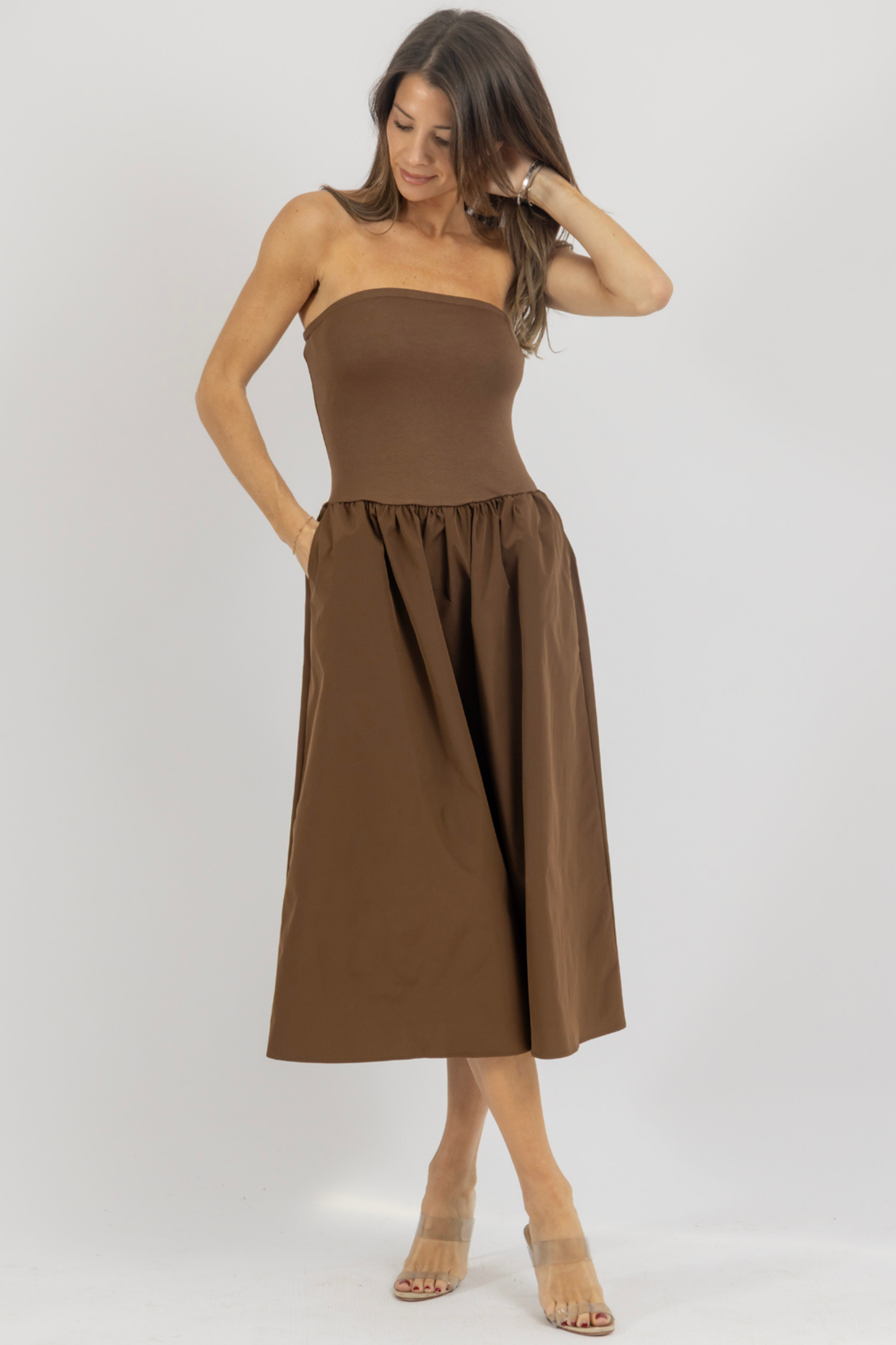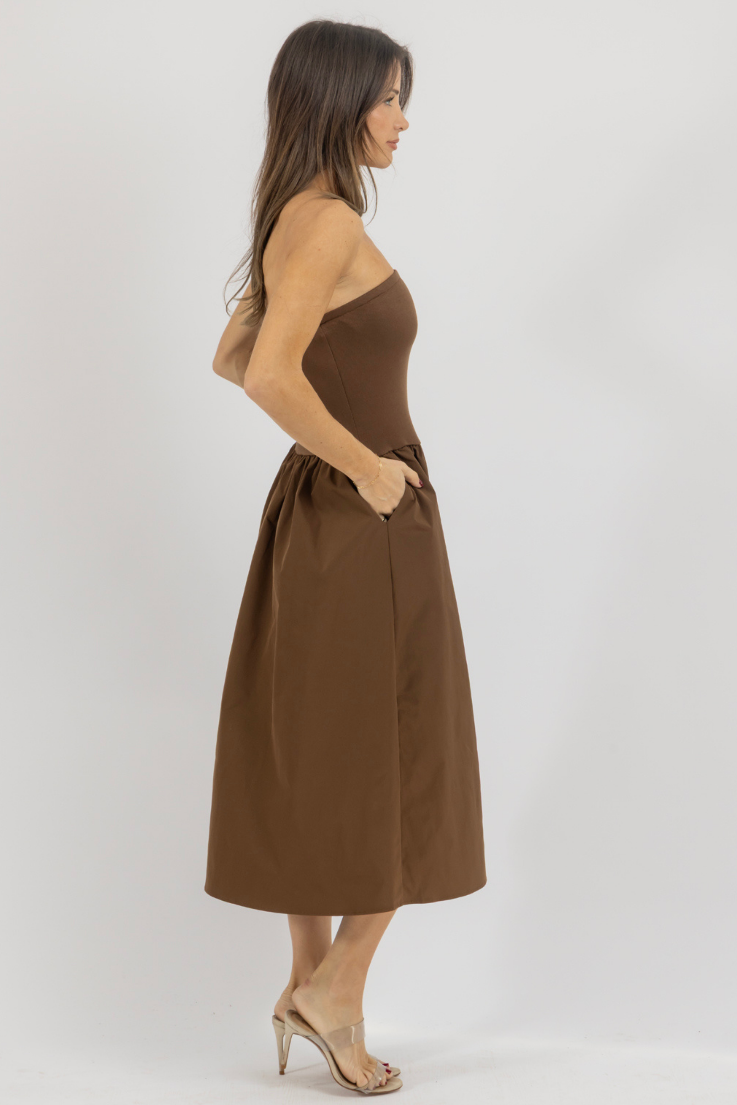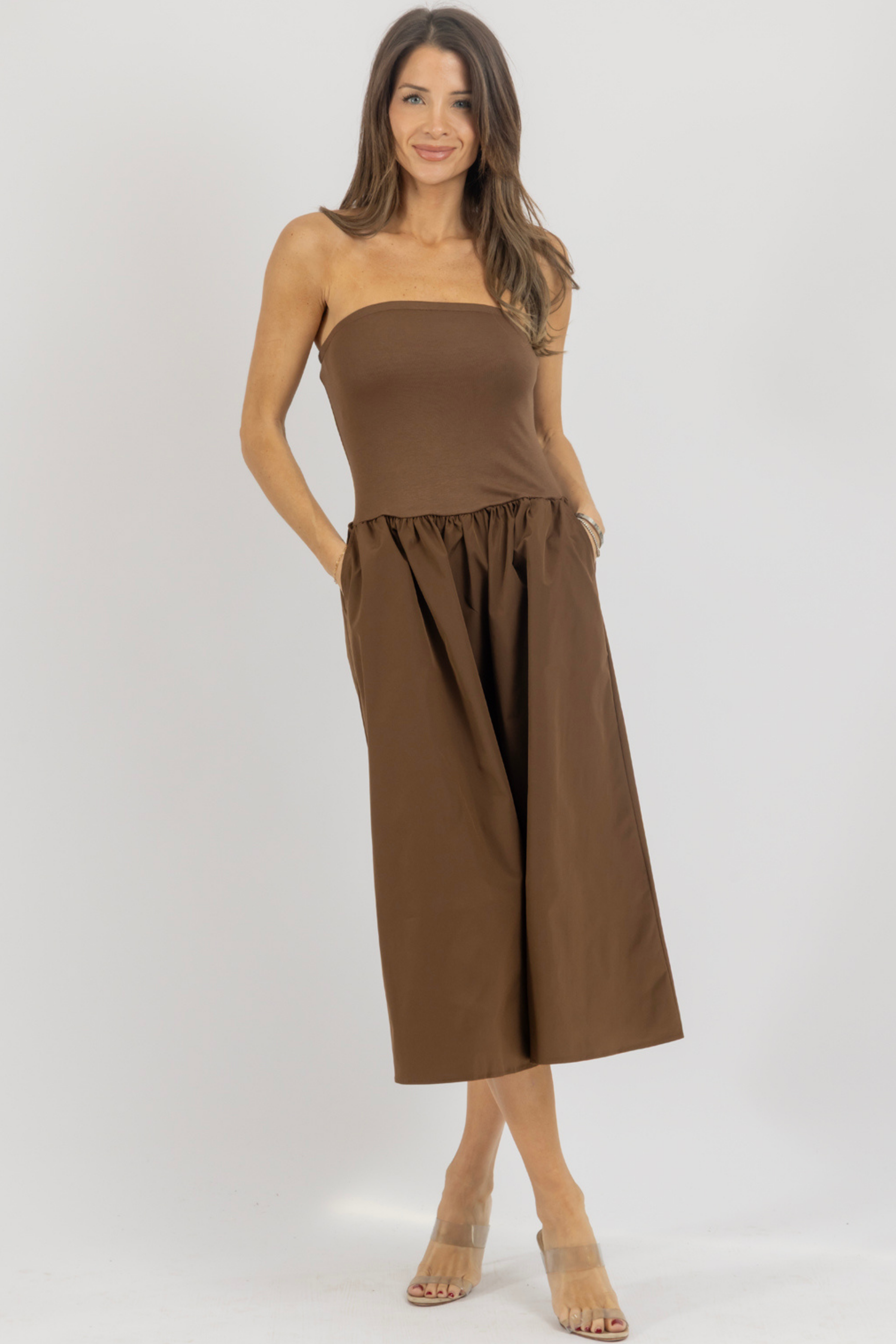 Strapless, Tube top, Maxi length, Contrast soft jersey knit top, Structured woven skirt, Hidden pockets