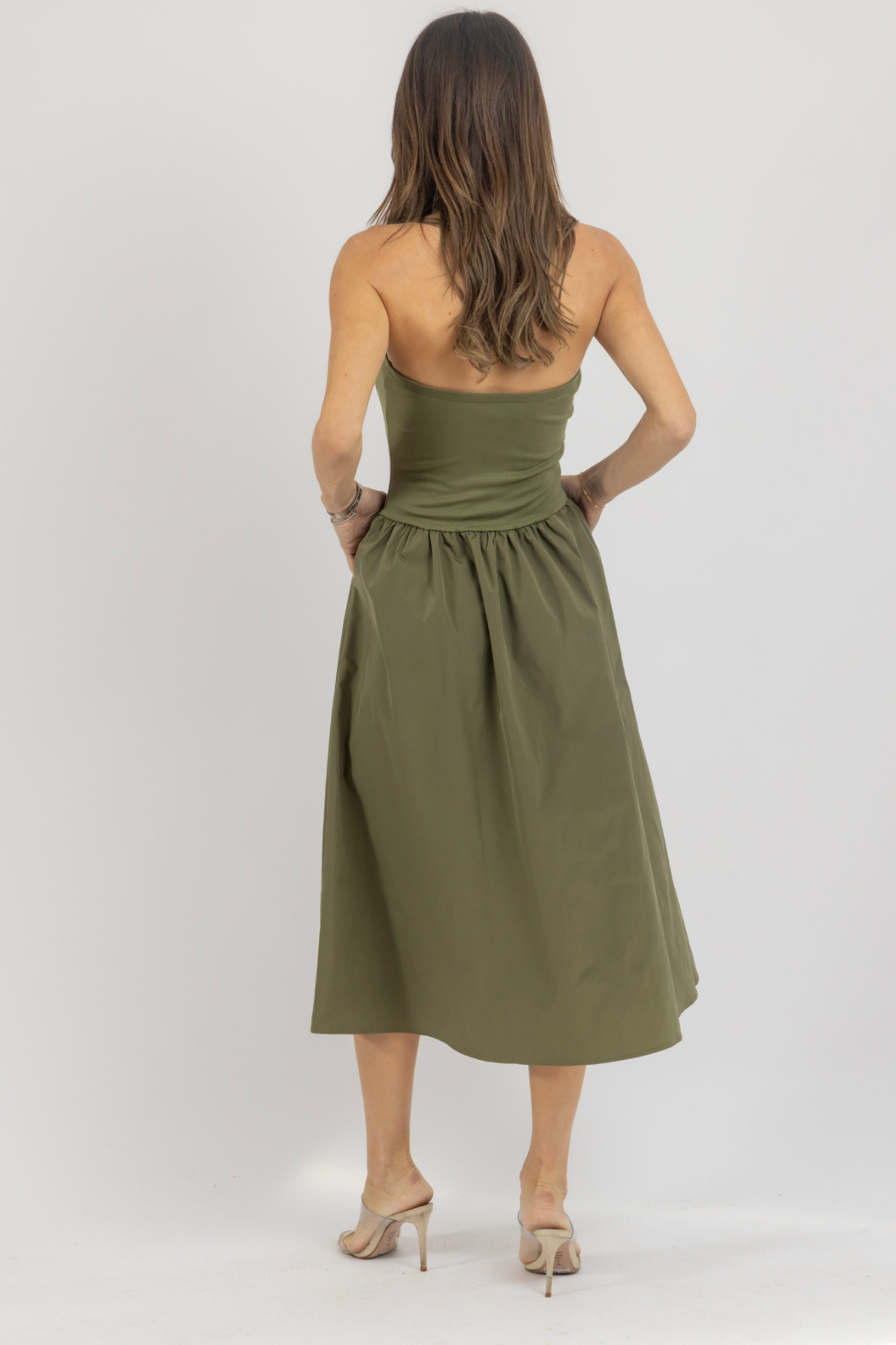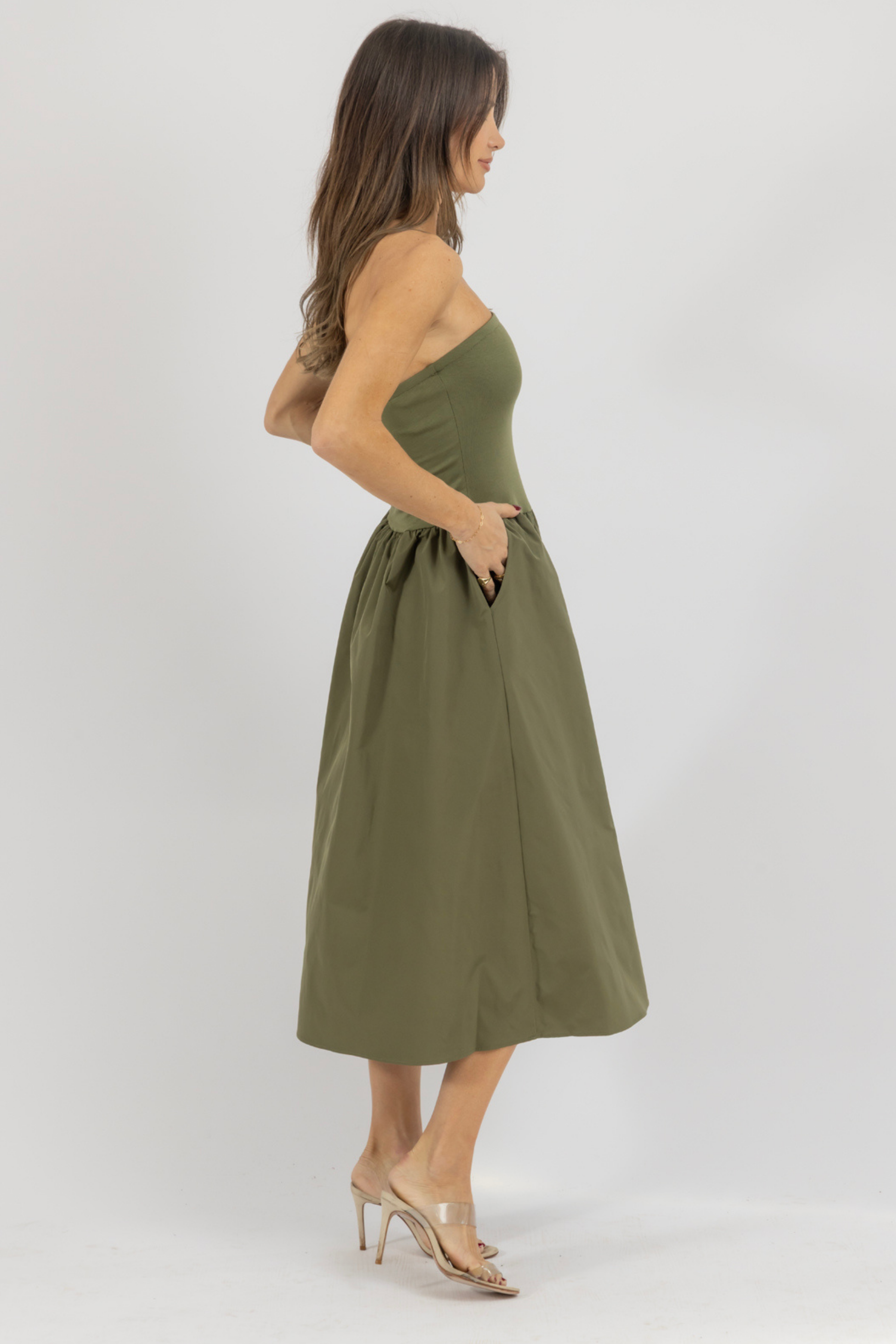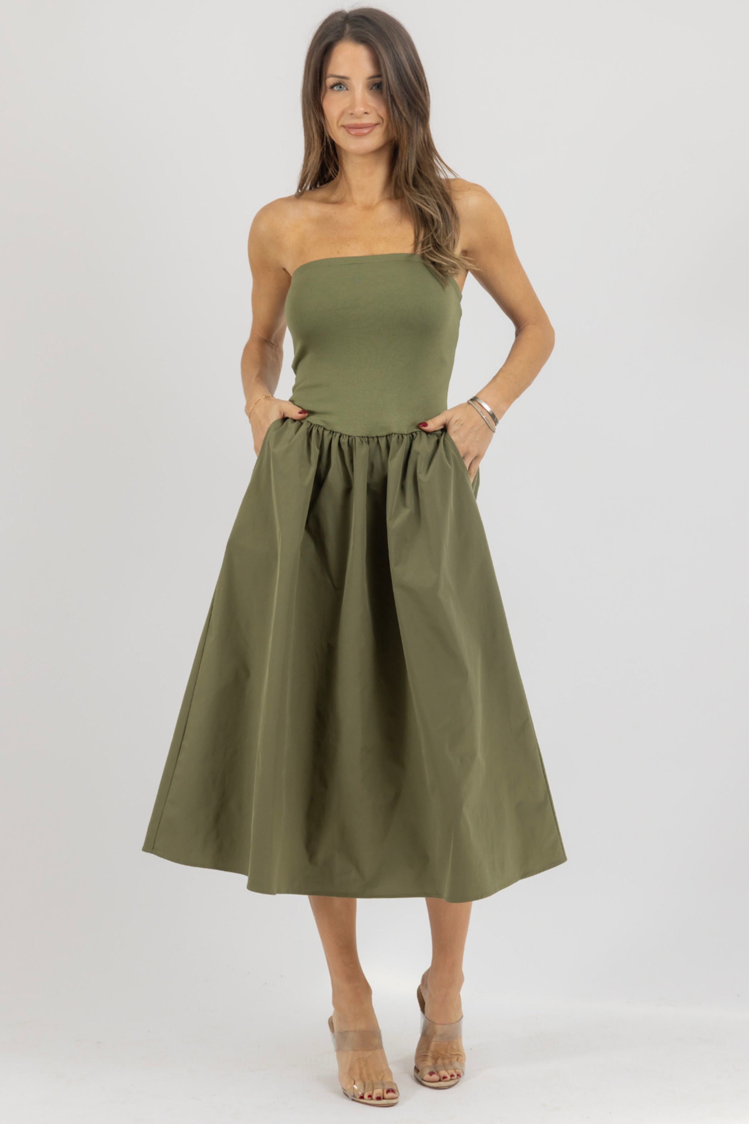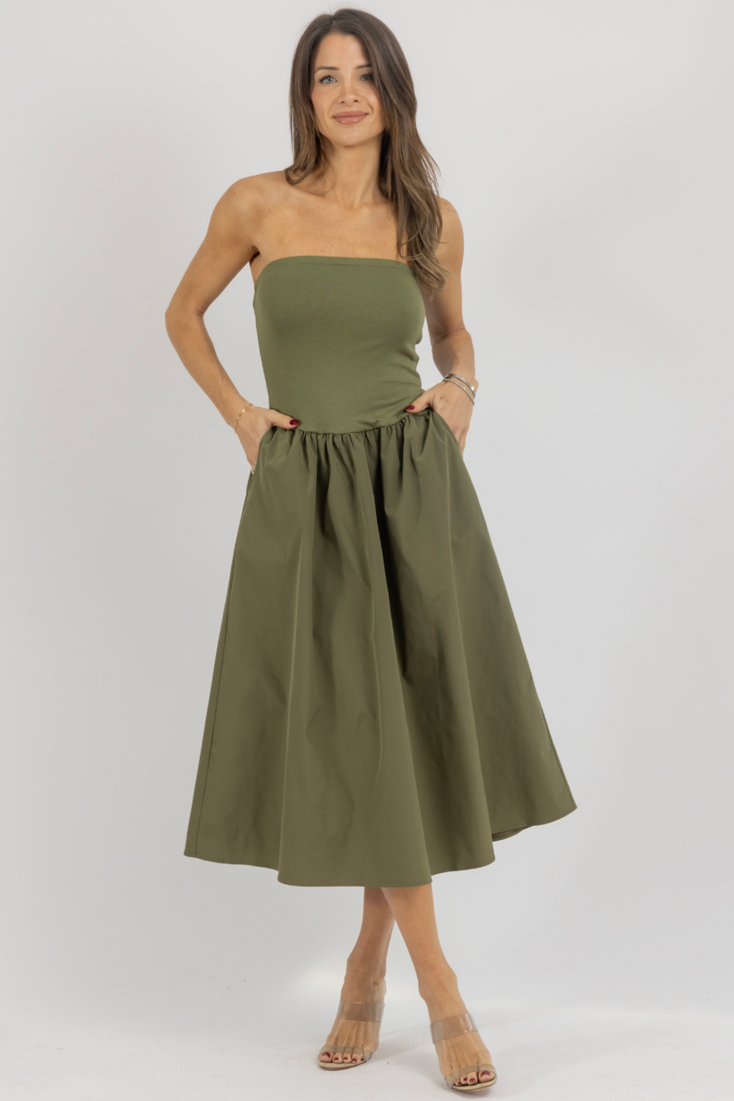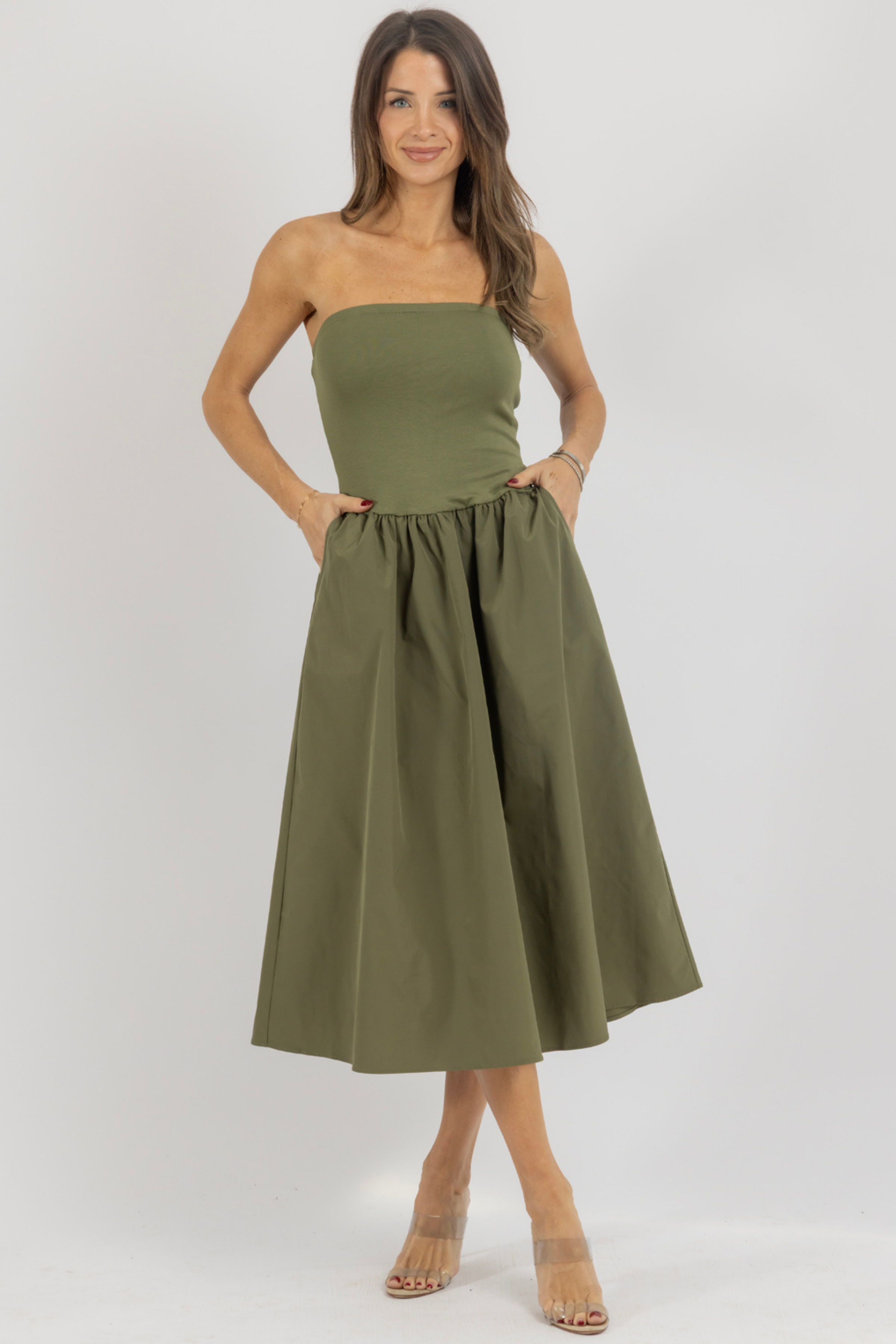 Strapless, Tube top, Maxi length, Contrast soft jersey knit top, Structured woven skirt, Hidden pockets