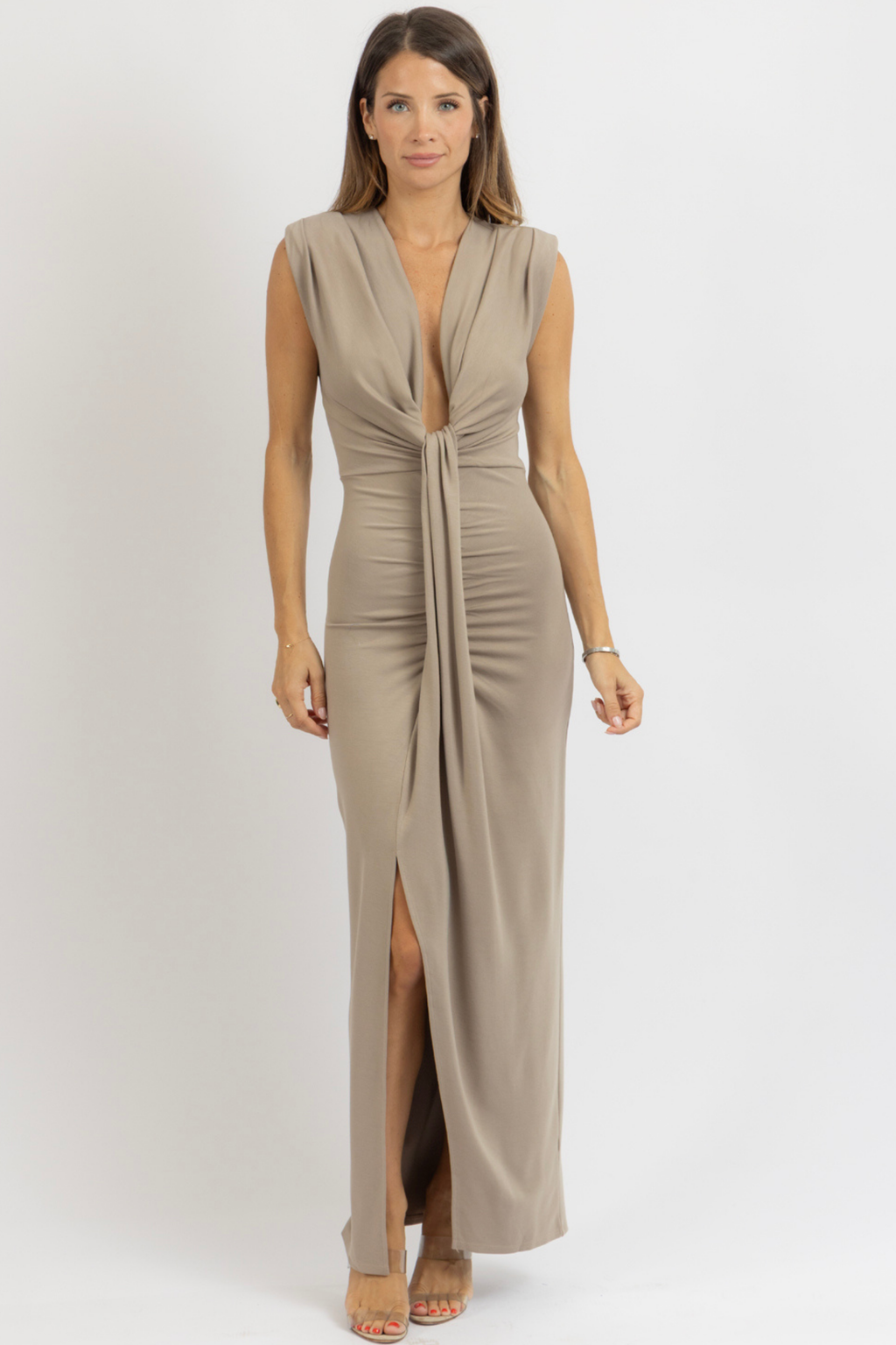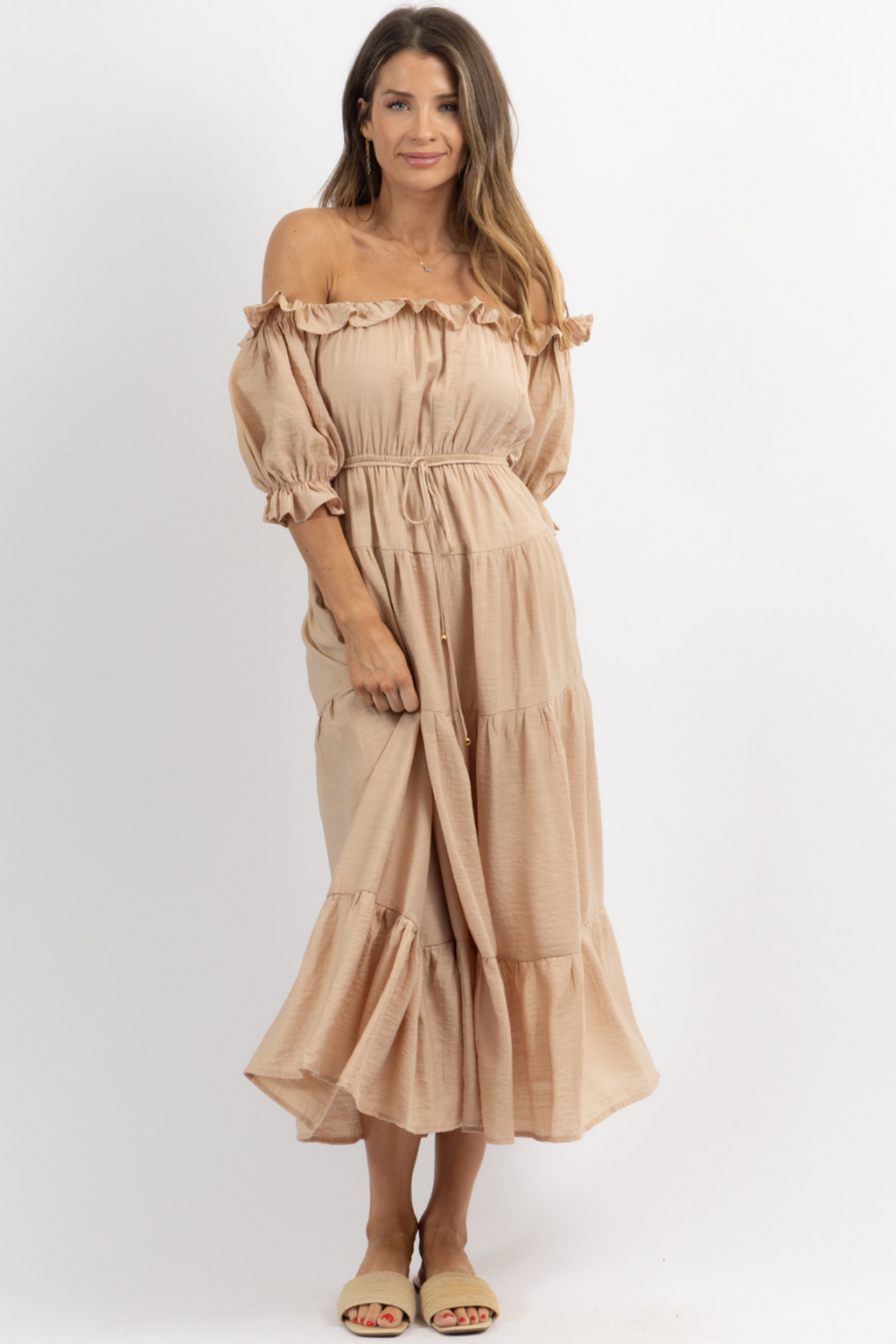NUDE OFF SHOULDER RUFFLE + TIE WAIST MAXI DRESS