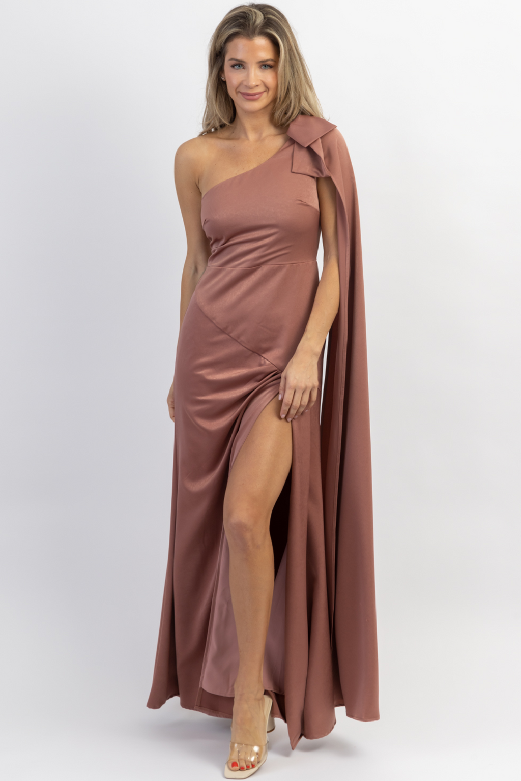 MAUVE ONE SHOULDER + SASH SATIN MAXI DRESS