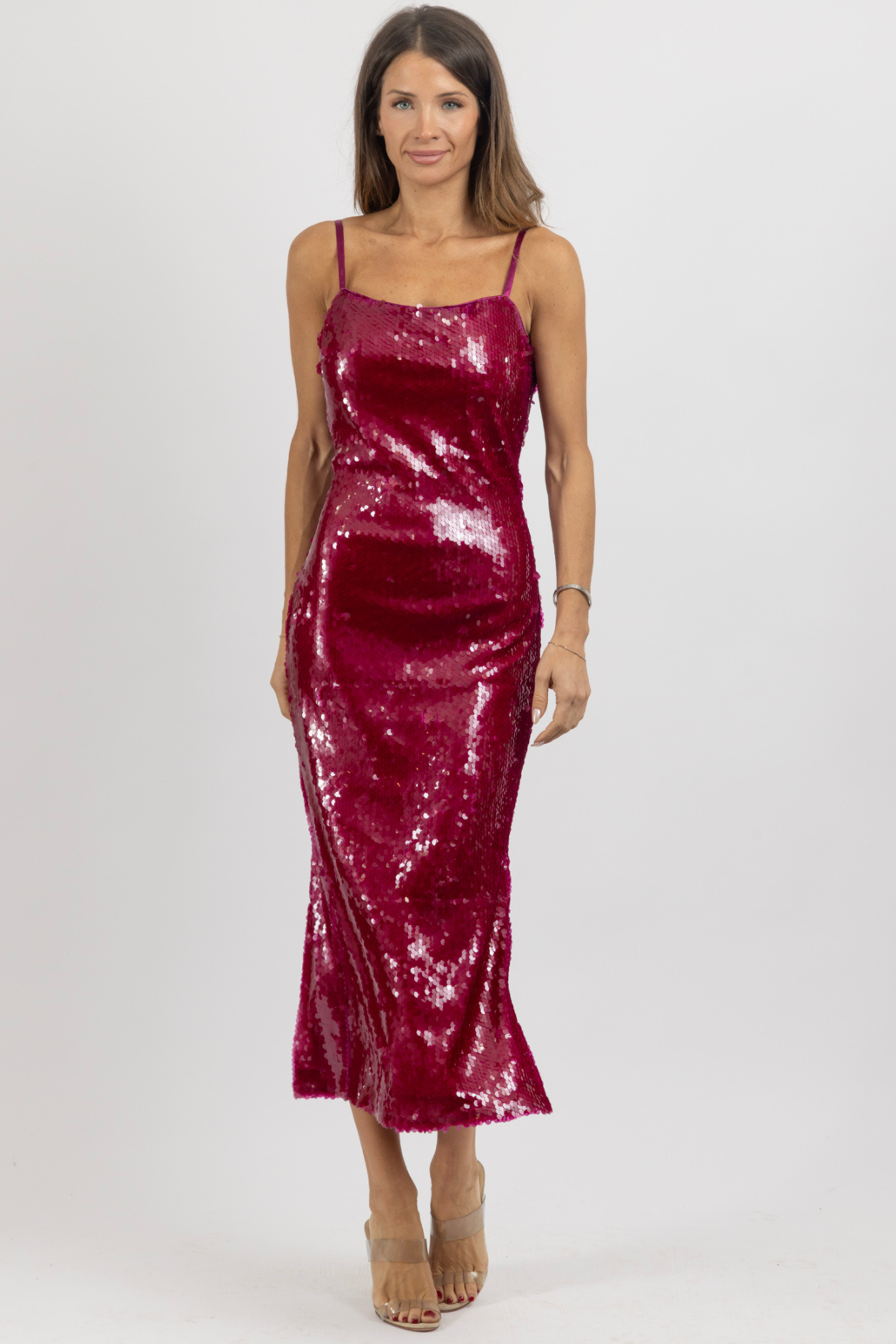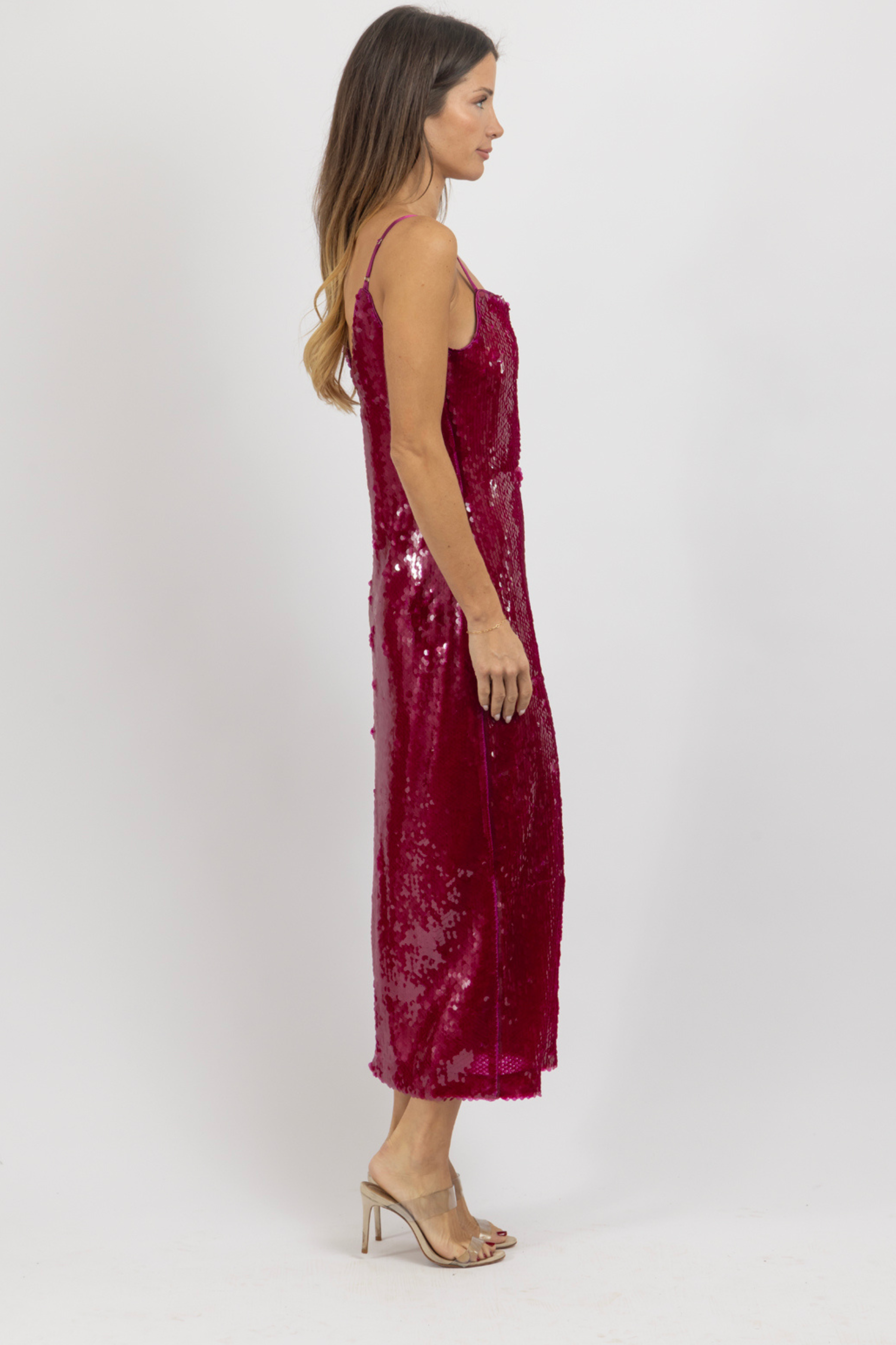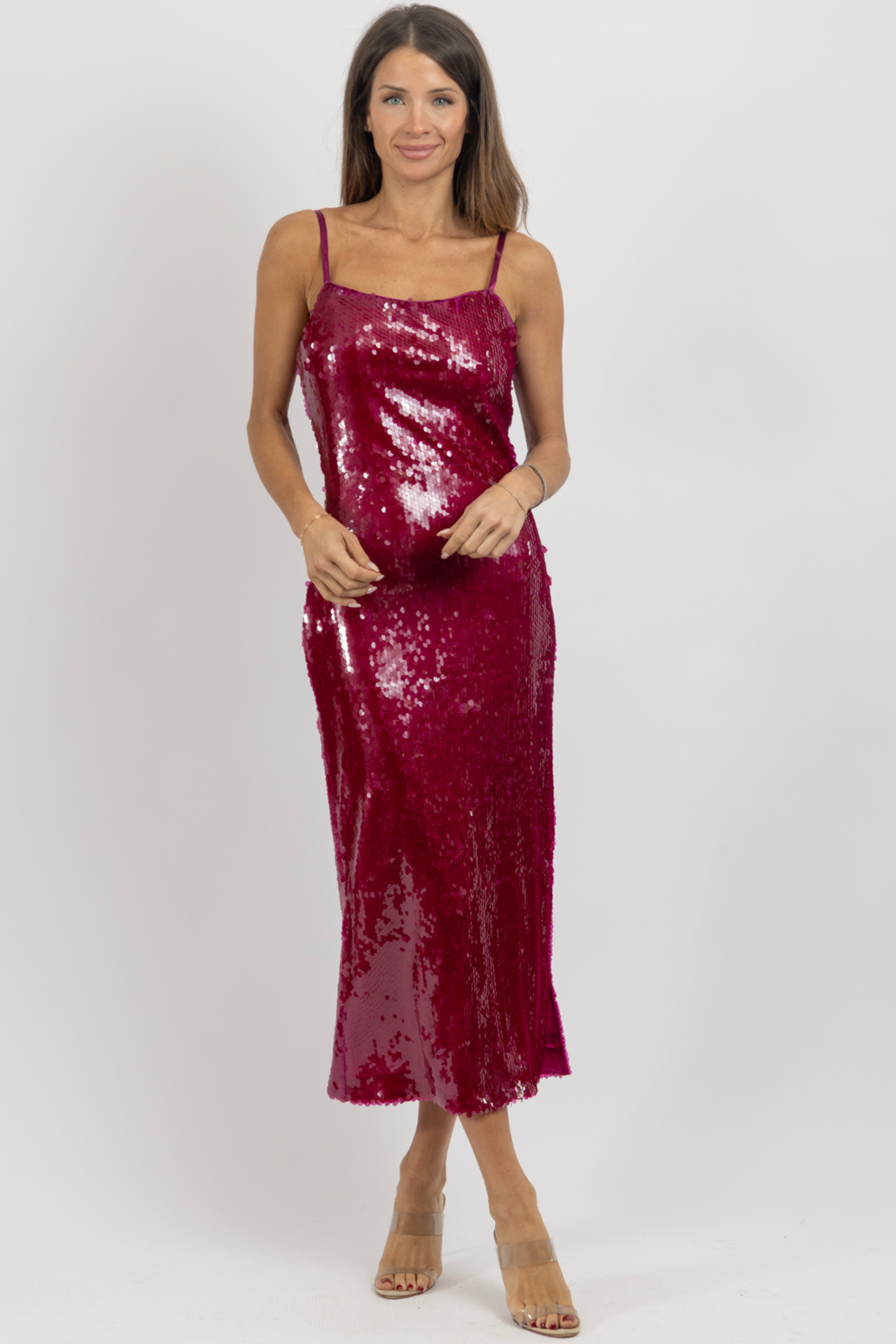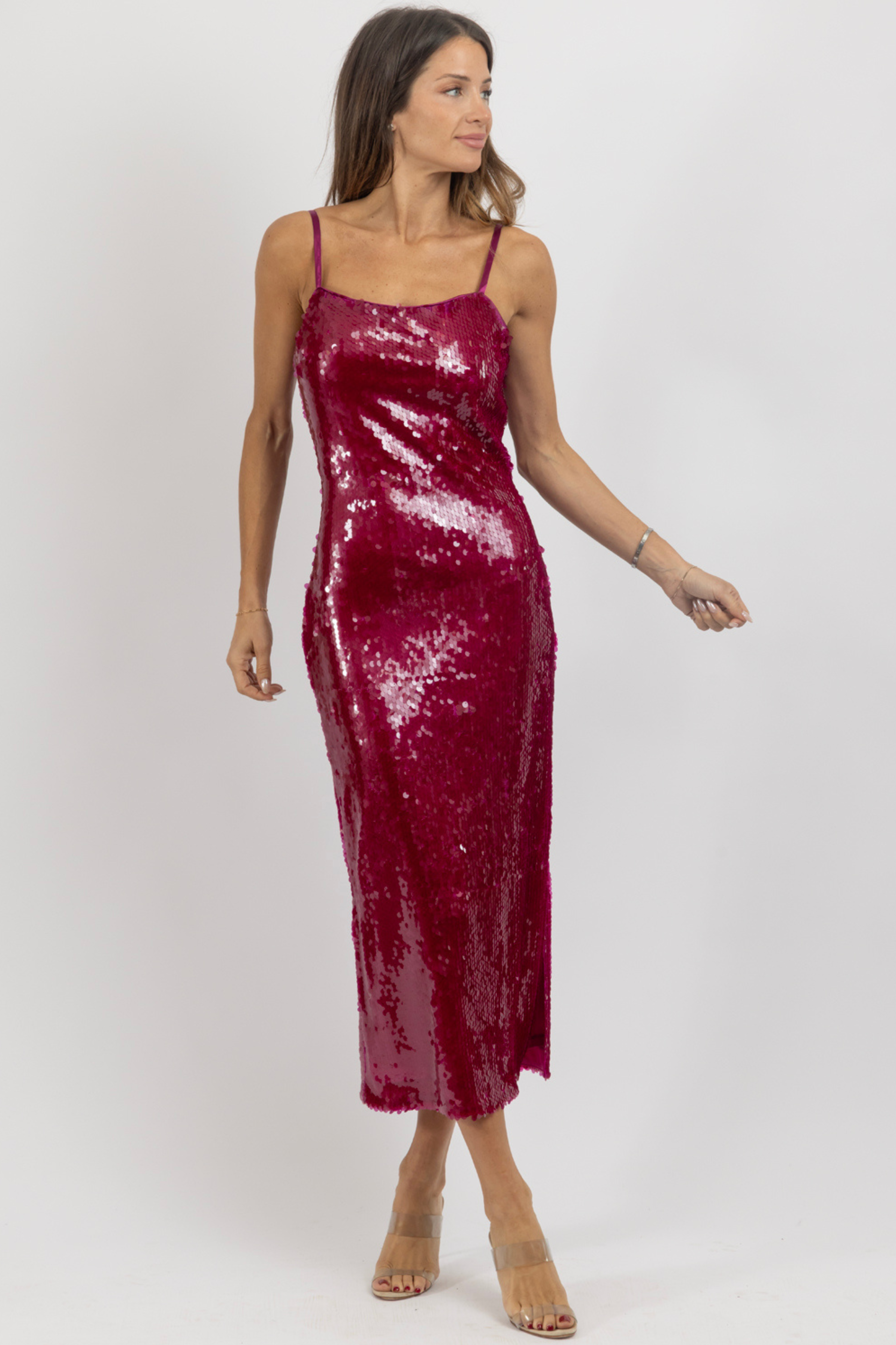 Form fitting, Spaghetti straps, Lined, Side slit, Deep V-back, Fitted sheath, Sequins throughout
