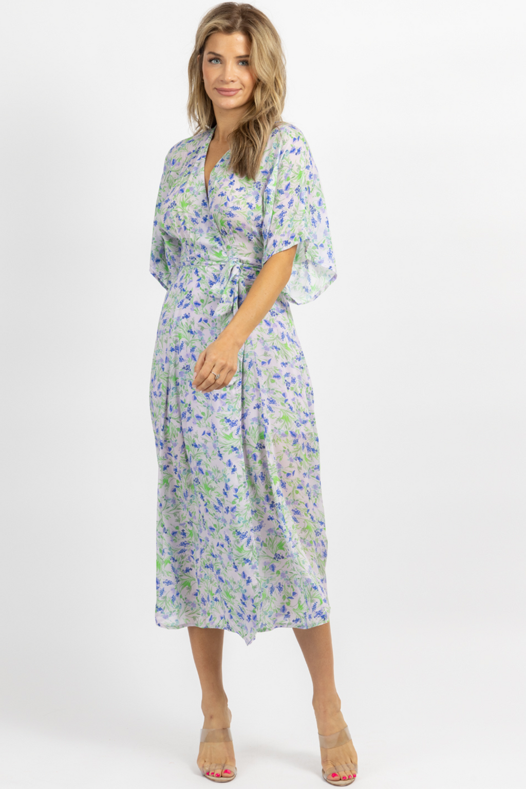 LAVENDER + BLUE FLORAL WRAPPED MIDI DRESS