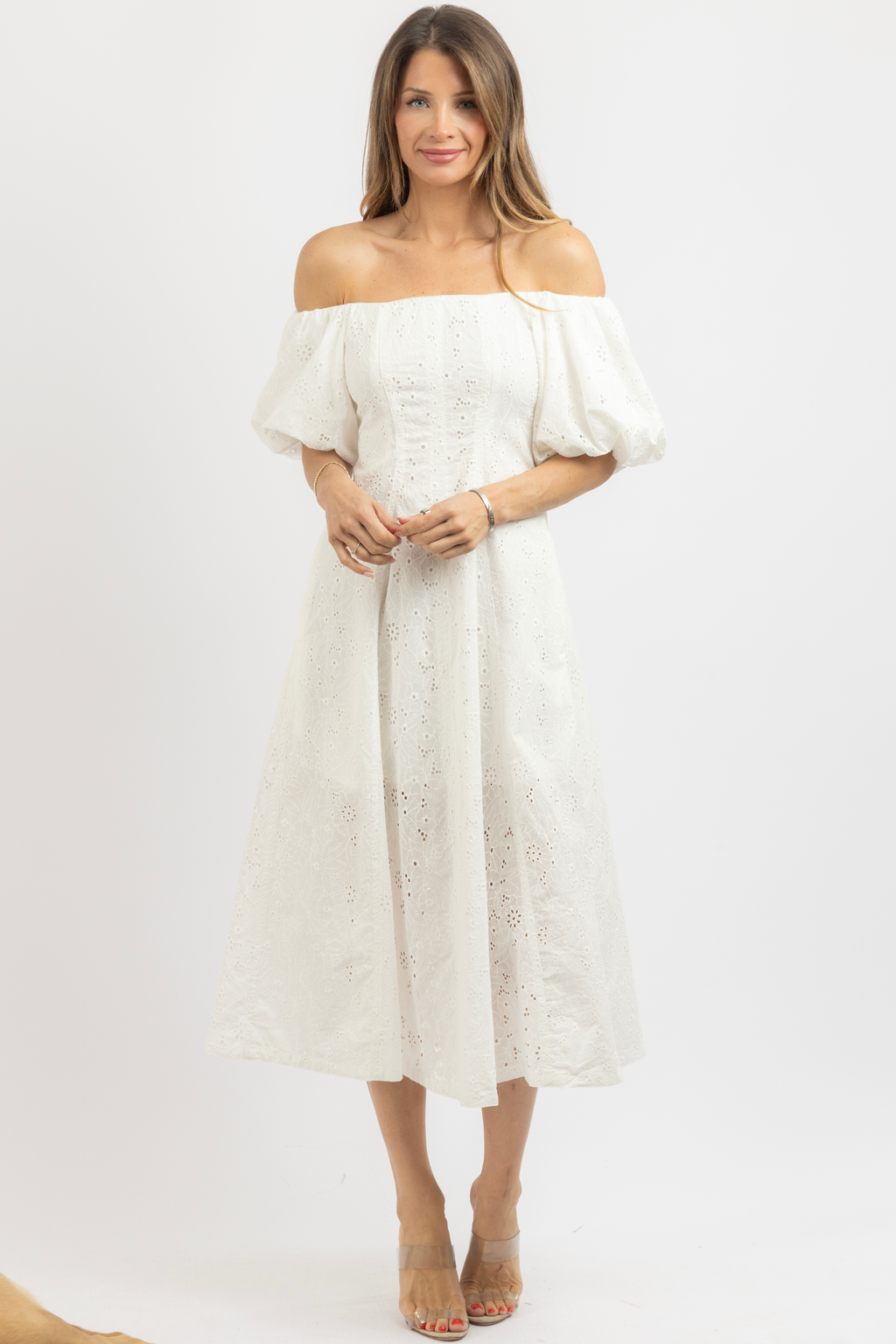 IVORY PUFF SLEEVE WAIST CUTOUT MIDI DRESS