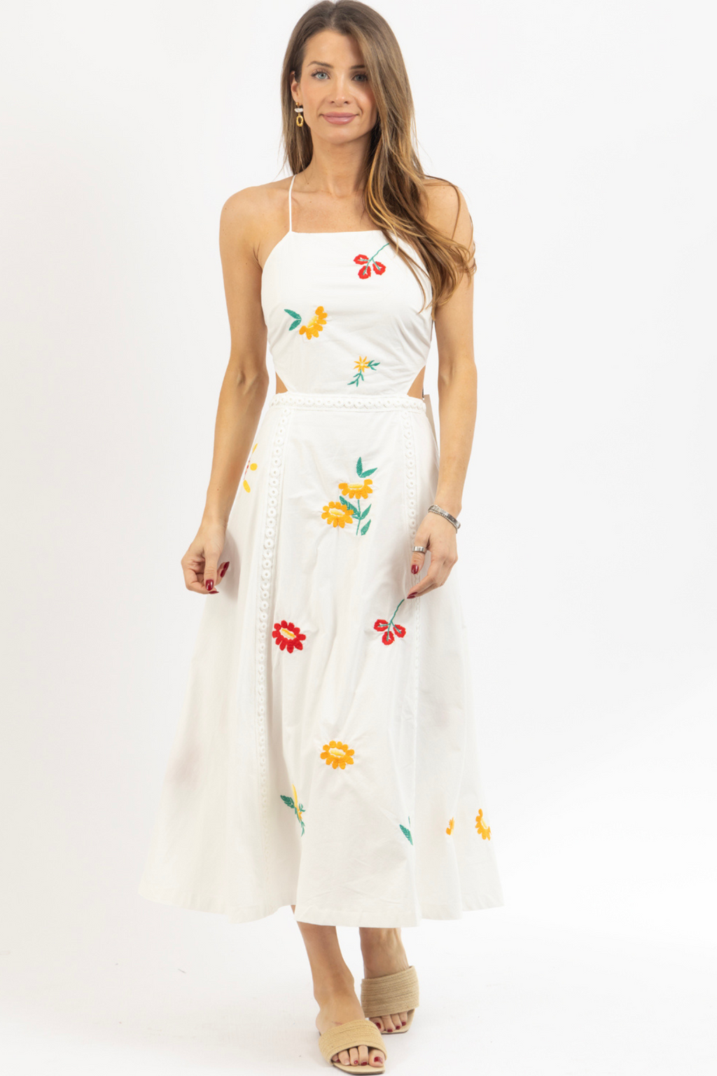 WHITE MESH EMBROIDERED LONGSLEEVE MIDI DRESS