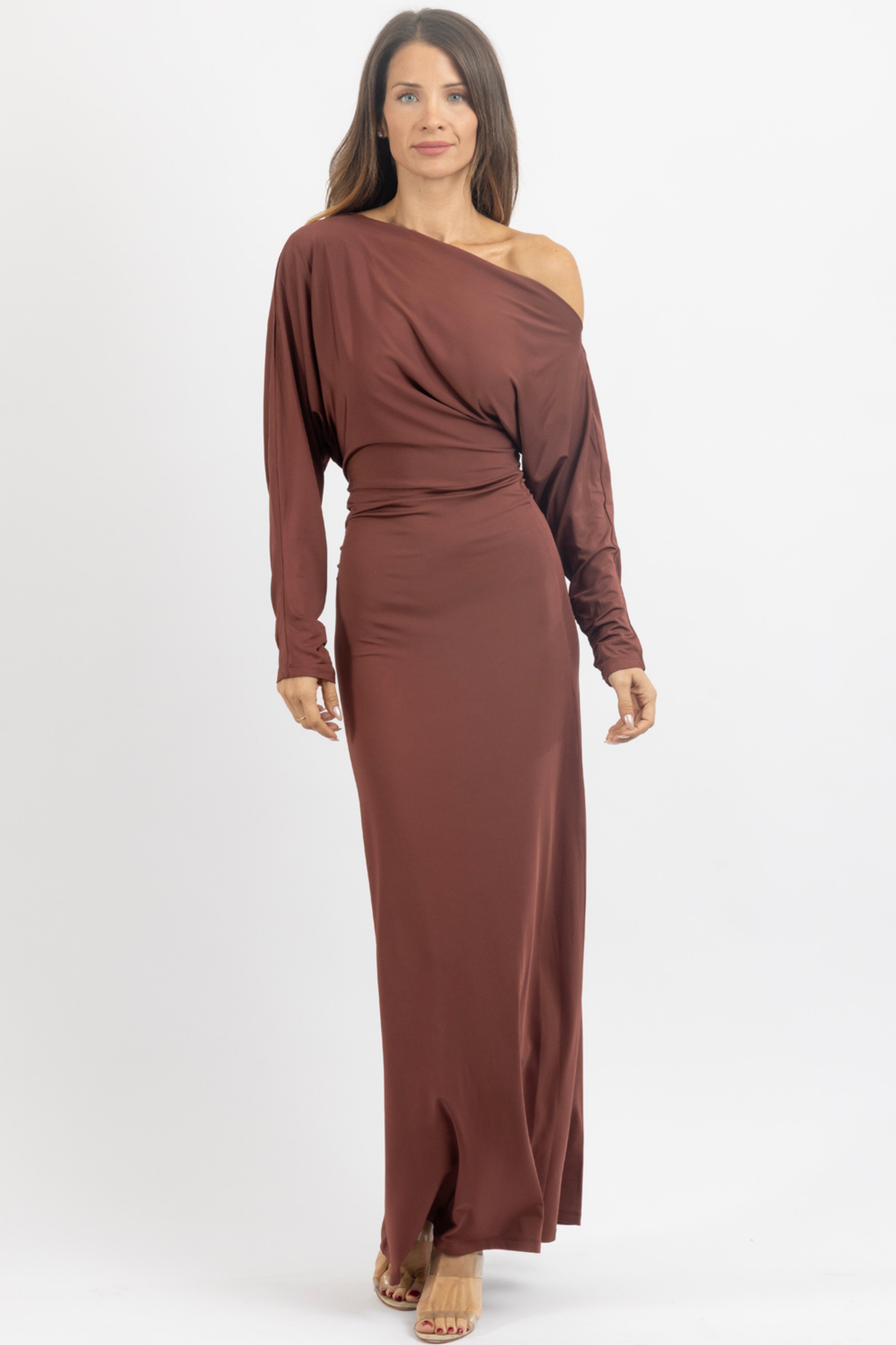 Maxi length, Long sleeves, One shoulder, Ruched detail, Lined