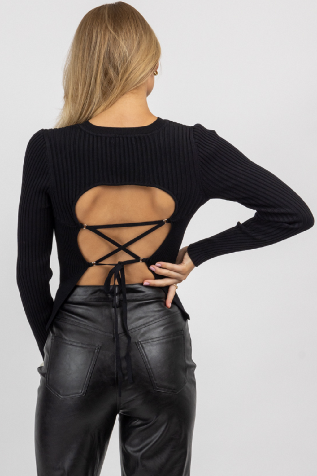 BLACK KNIT BACKLESS SELF-TIE CROP