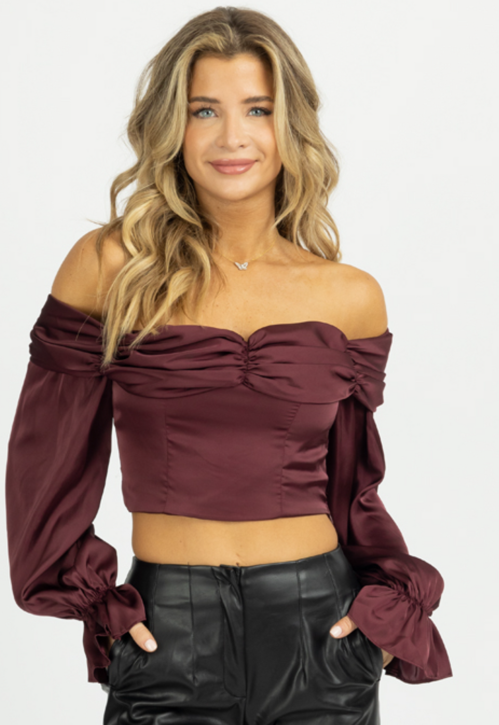 BURGUNDY SATIN OFF SHOULDER BLOUSE