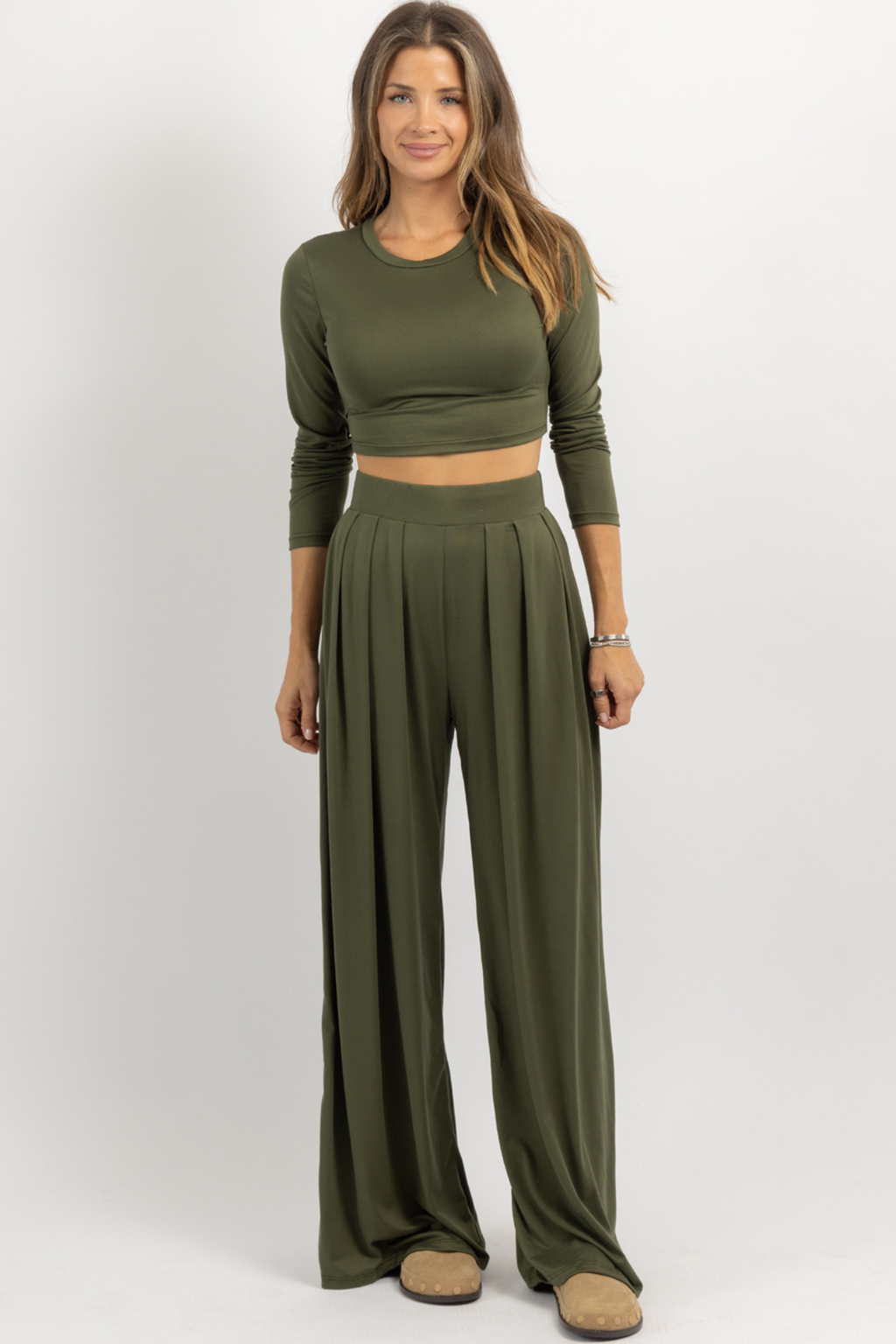 OLIVE LONG SLEEVE BUTTER SOFT PALAZZO PANT SET