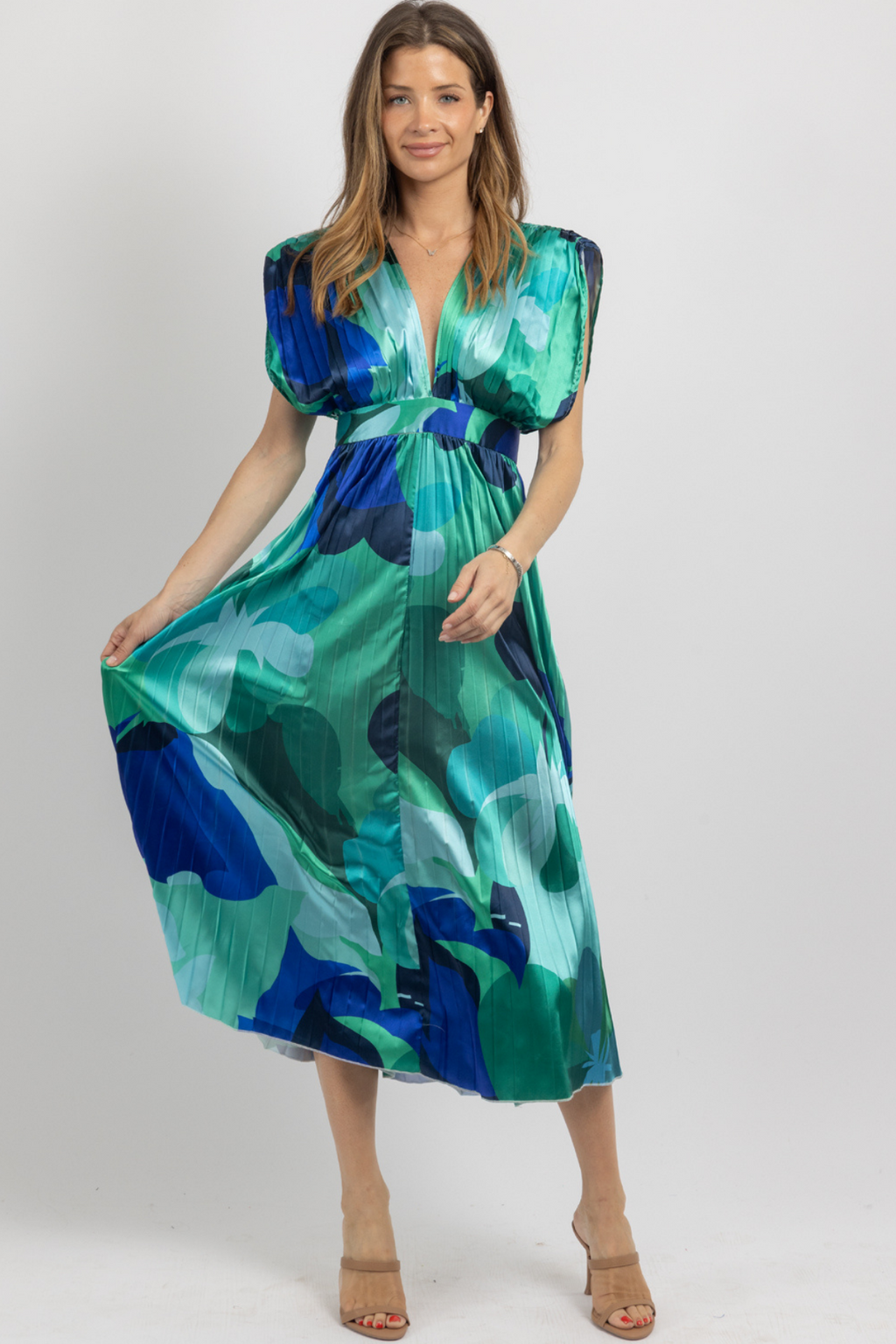 SAGE SATIN WATERCOLOR CUTOUT MIDI DRESS