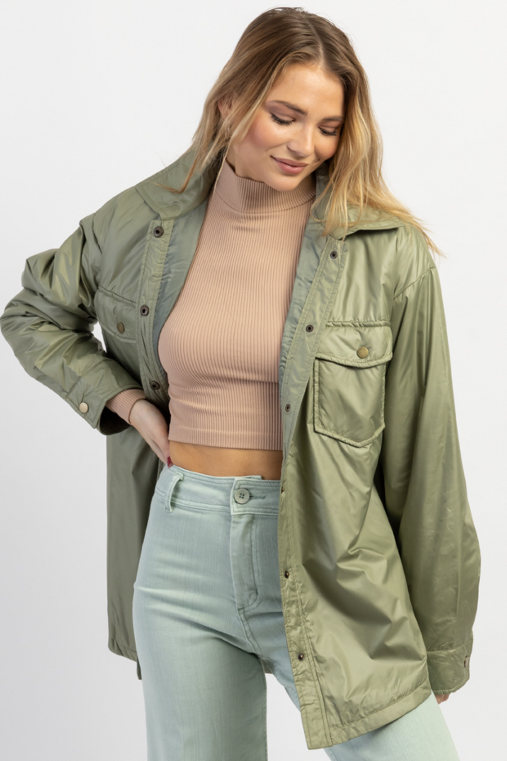 STAPLE SHIRRED SAGE MOCK NECK TOP