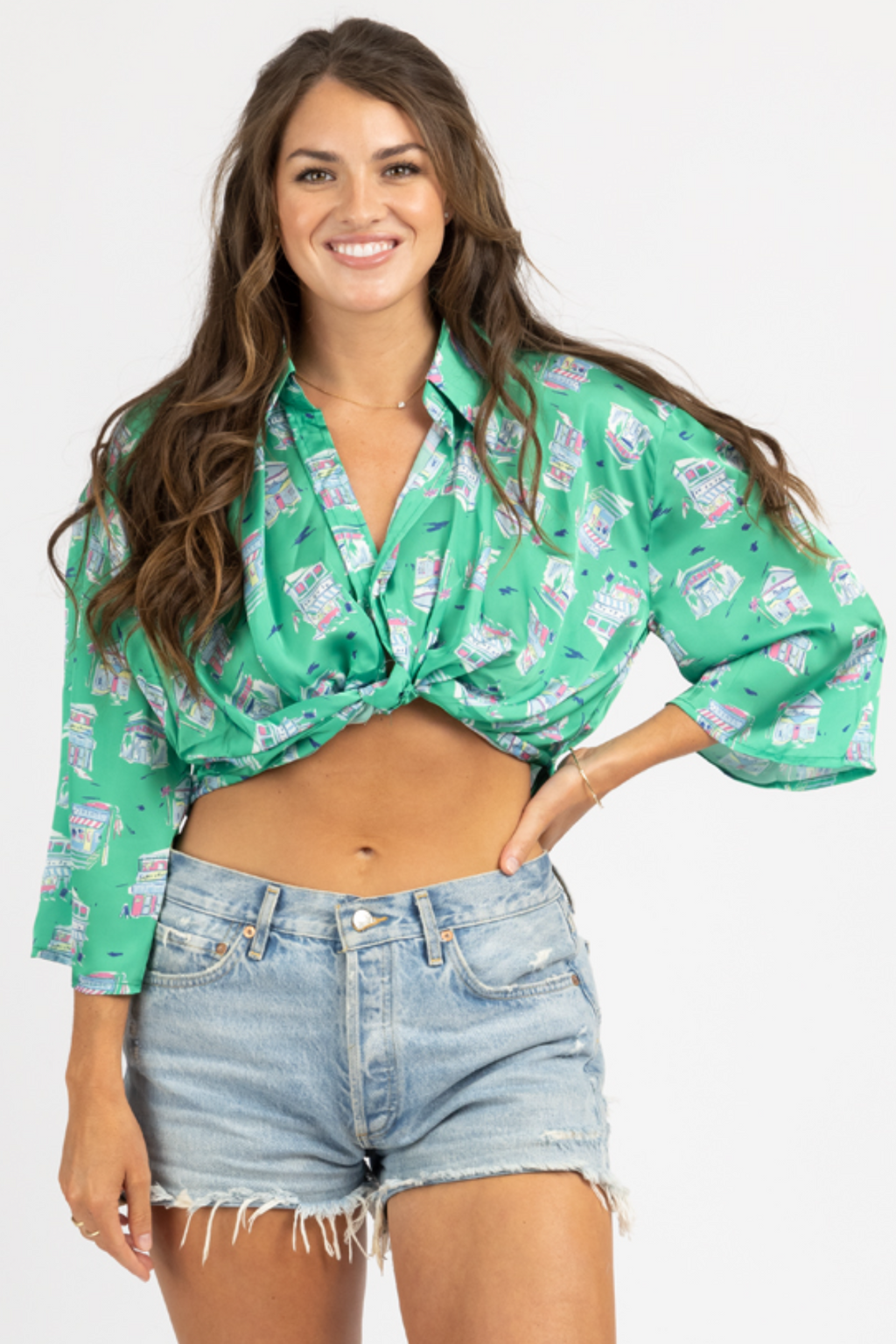 GREEN FLORAL OPEN BACK SILKY CROP TOP