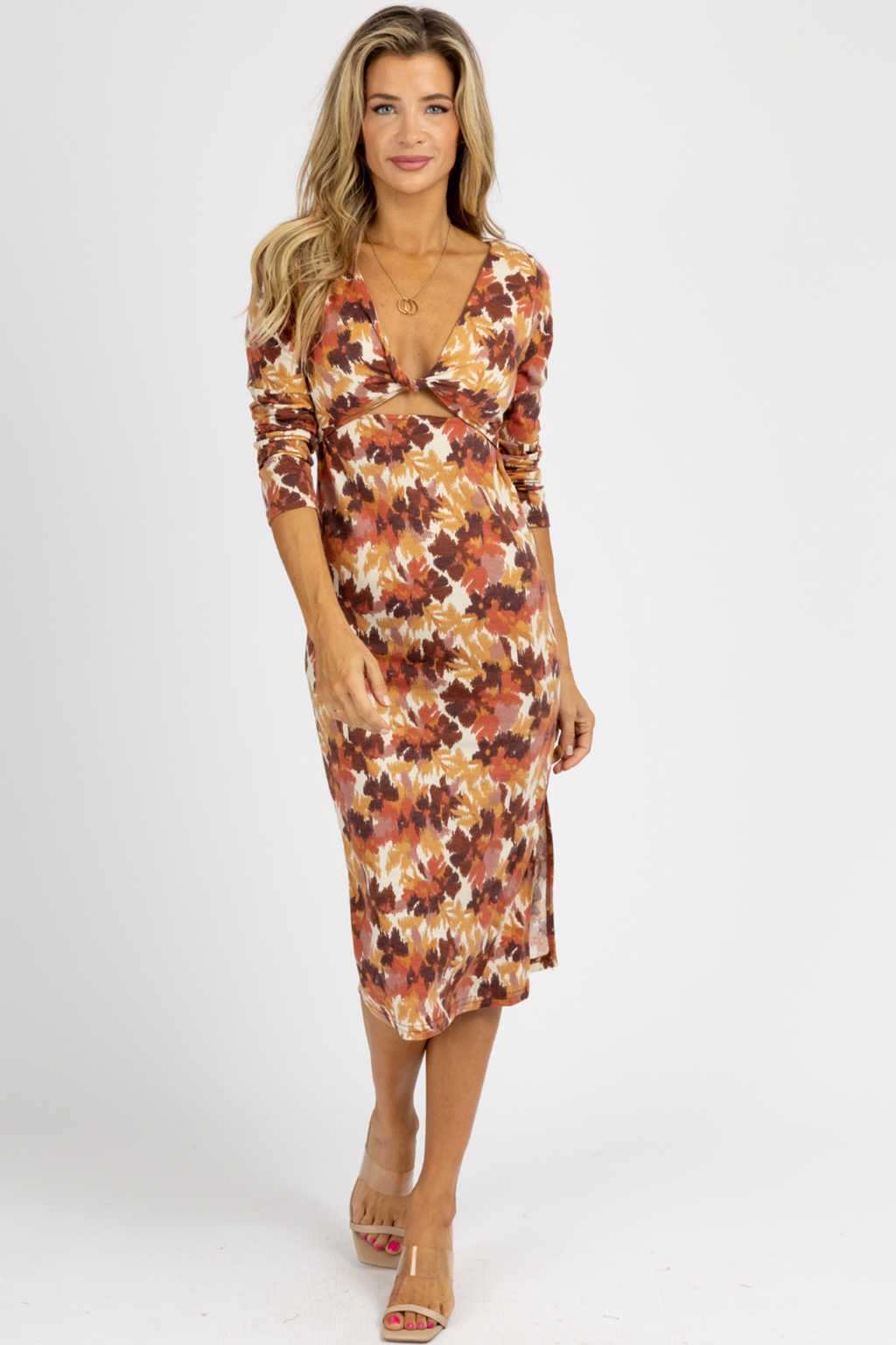 ECRU BROWN MULTIPRINT FRONT TWIST MIDI DRESS