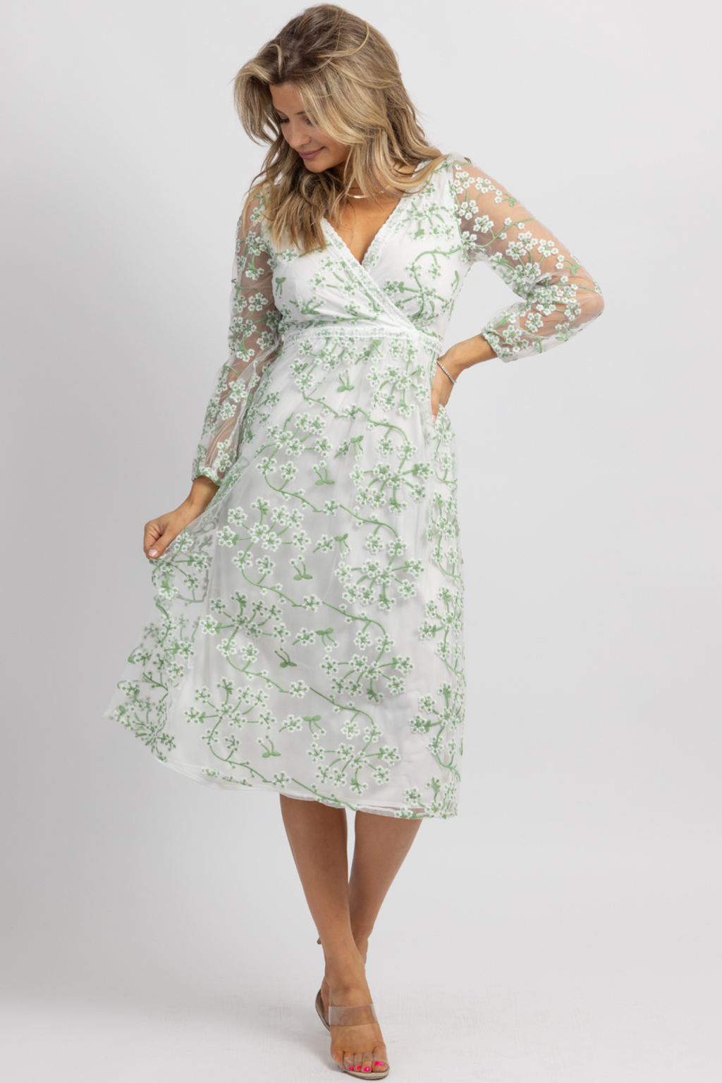 WHITE MESH EMBROIDERED LONGSLEEVE MIDI DRESS