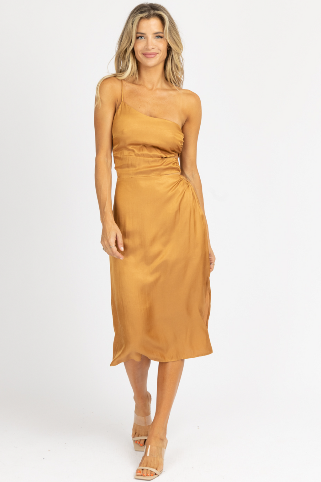 CARAMEL O-RING SATIN ONE SHOULDER MIDI DRESS
