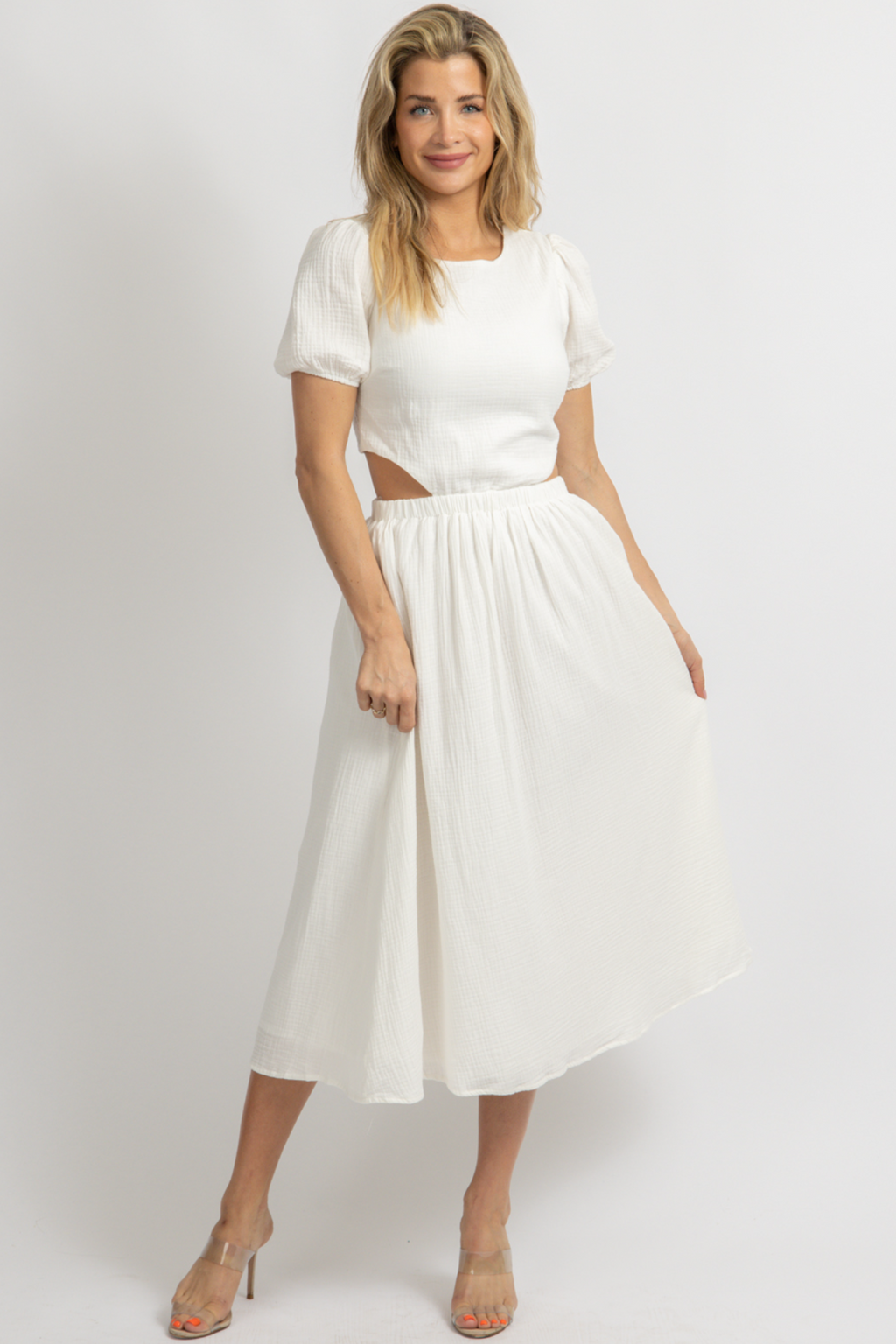 IVORY PUFF SLEEVE WAIST CUTOUT MIDI DRESS