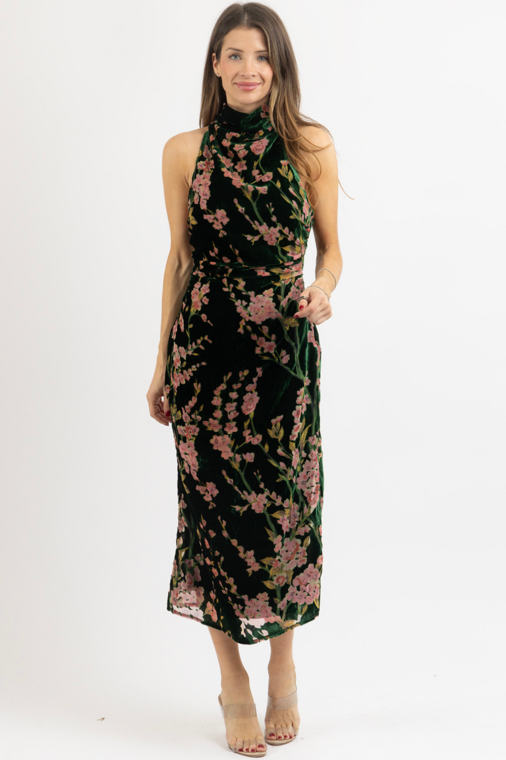 PALM GREEN ASYMMETRIC RUCHE MIDI DRESS