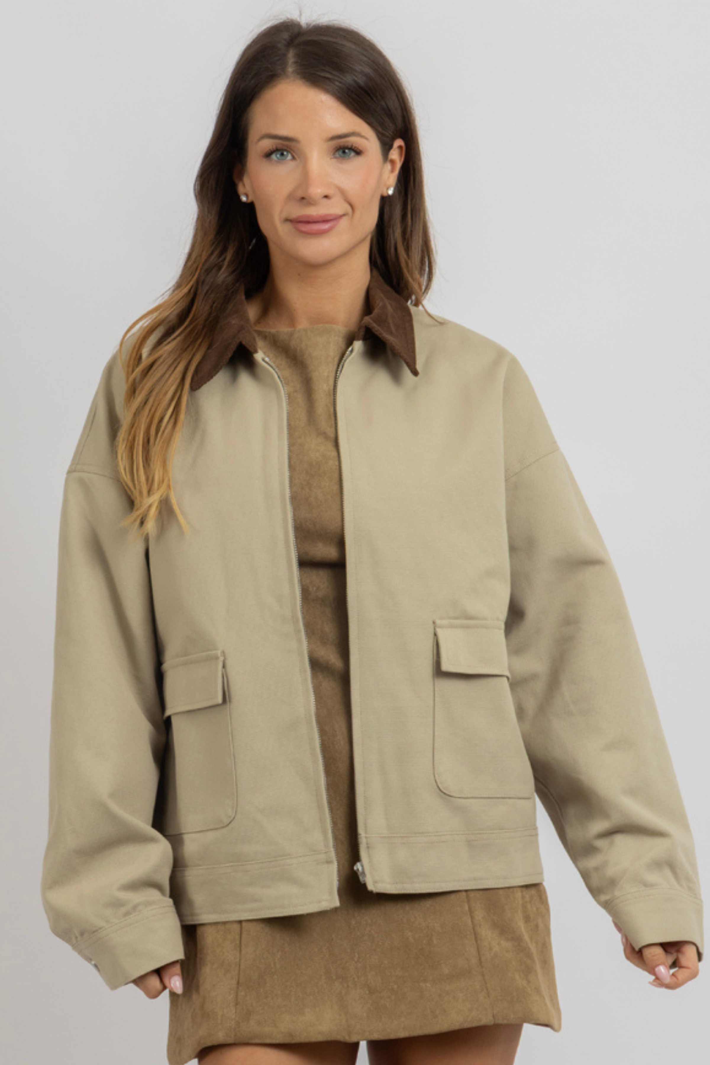 Relaxed fit, Long sleeves, Contrast hem, Front pockets, Zippered front