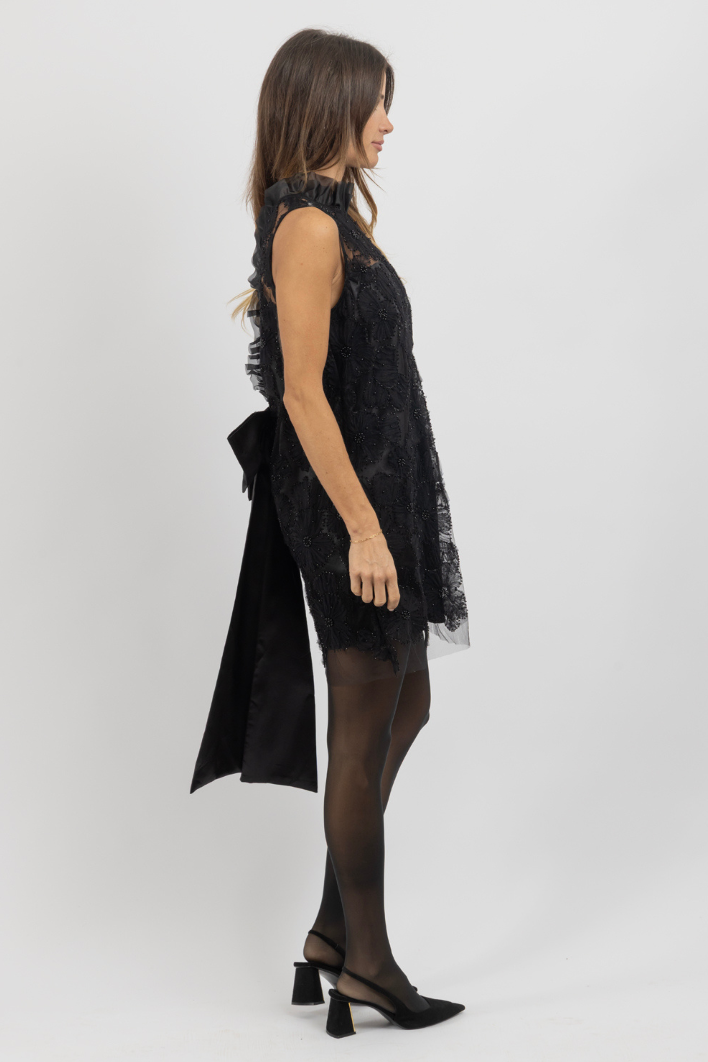 Floral detail with lace beaded detail, Sleeveless, Bow back detail, Sheer, Lined, Ruffled mock neckline