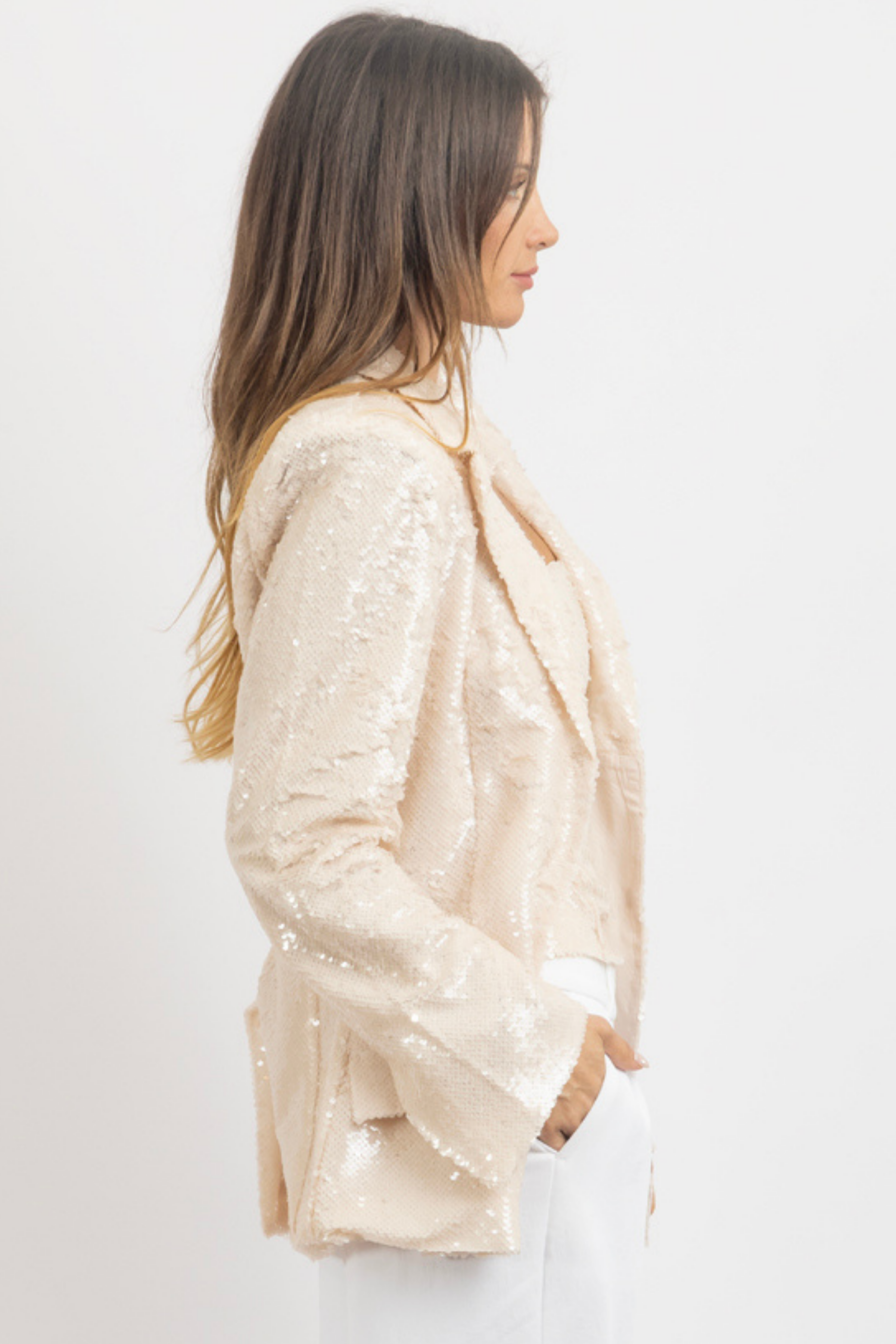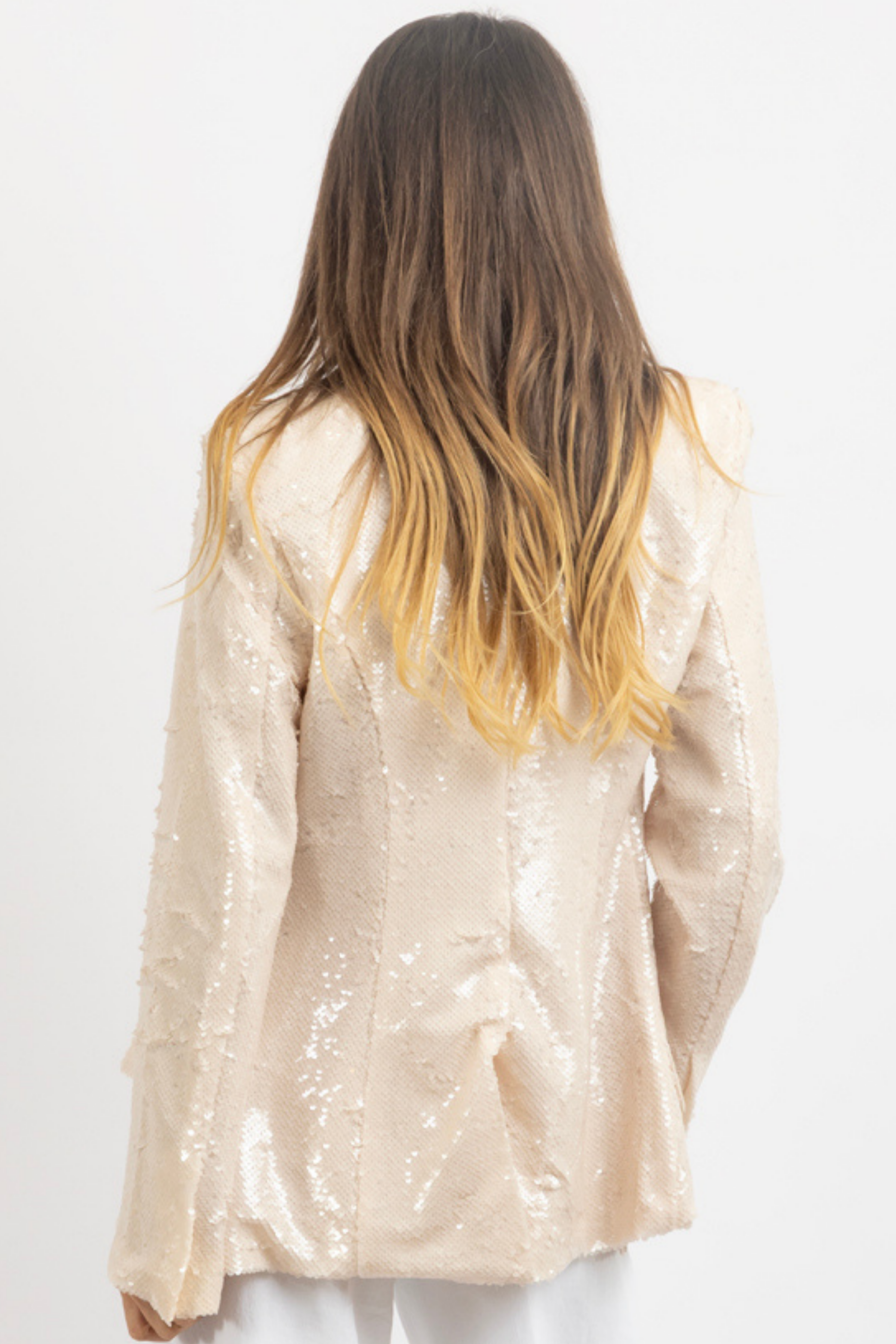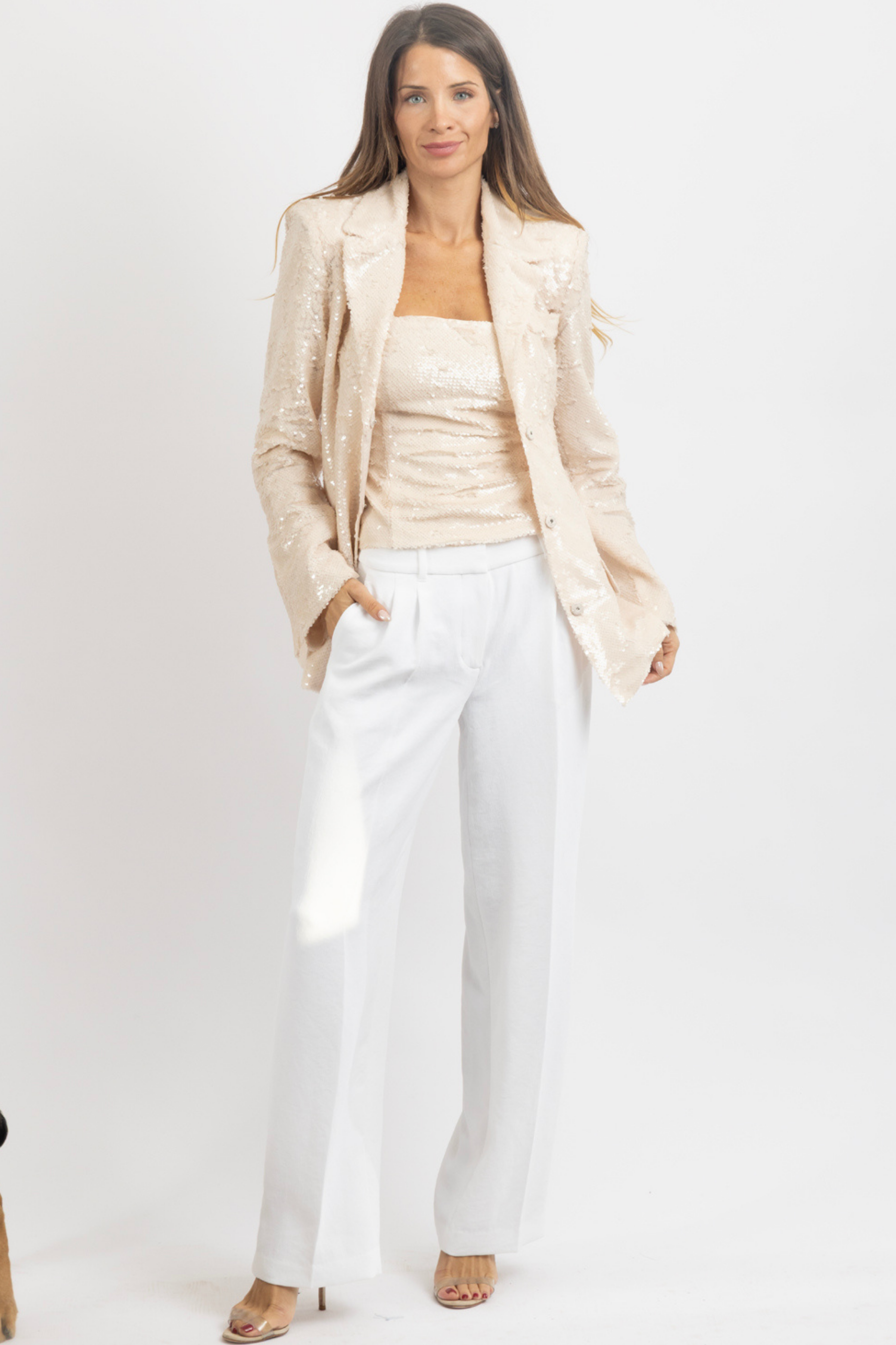 Sold together, Sequined throughout, Strapless tube top with zip closure, Oversized blazer, Lined