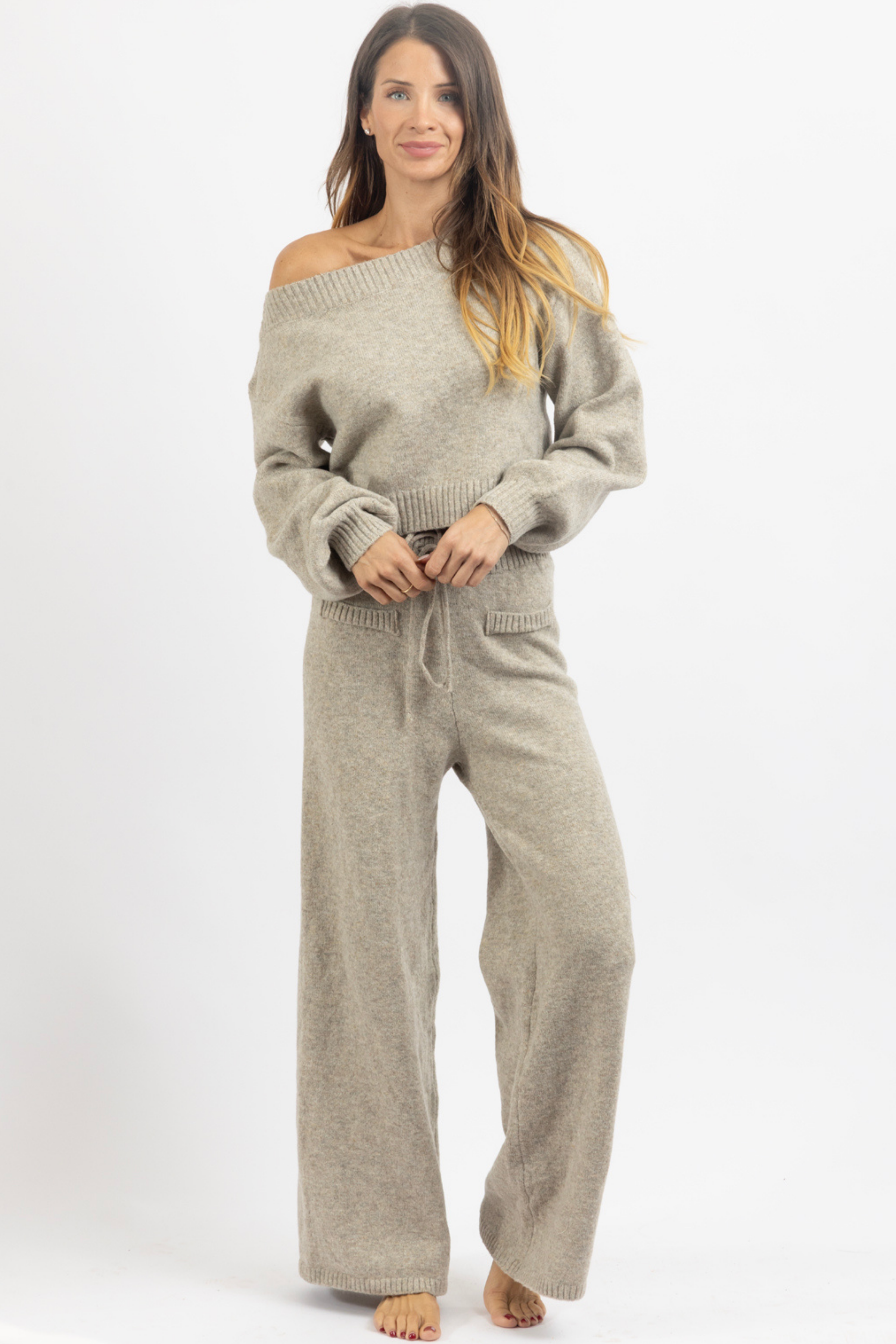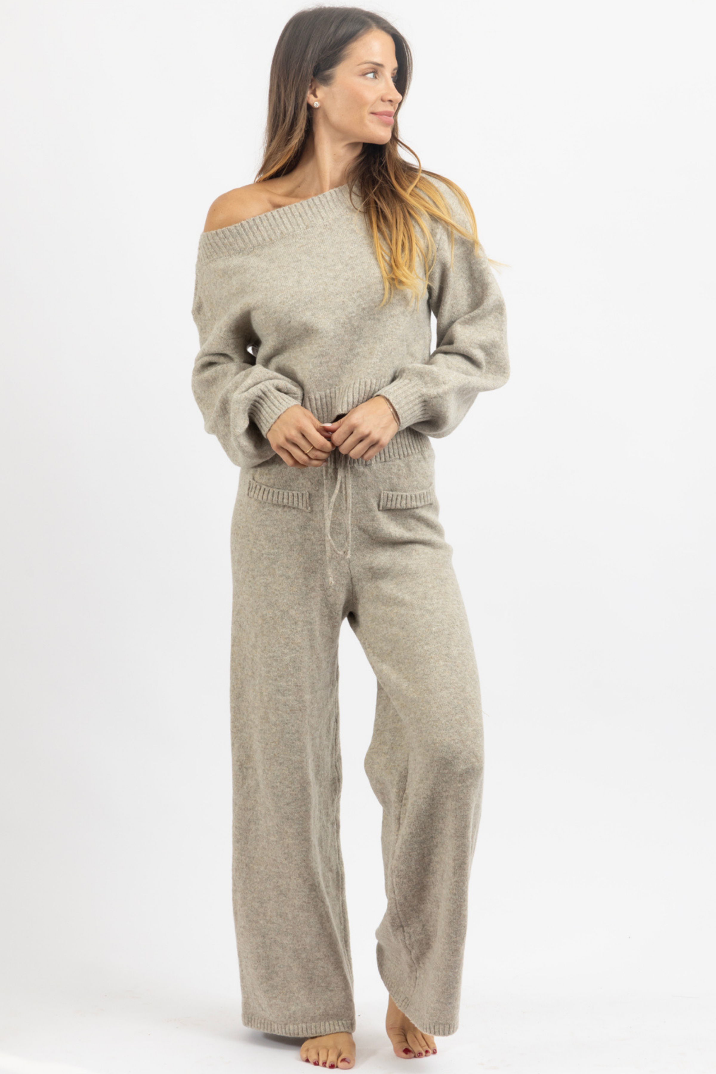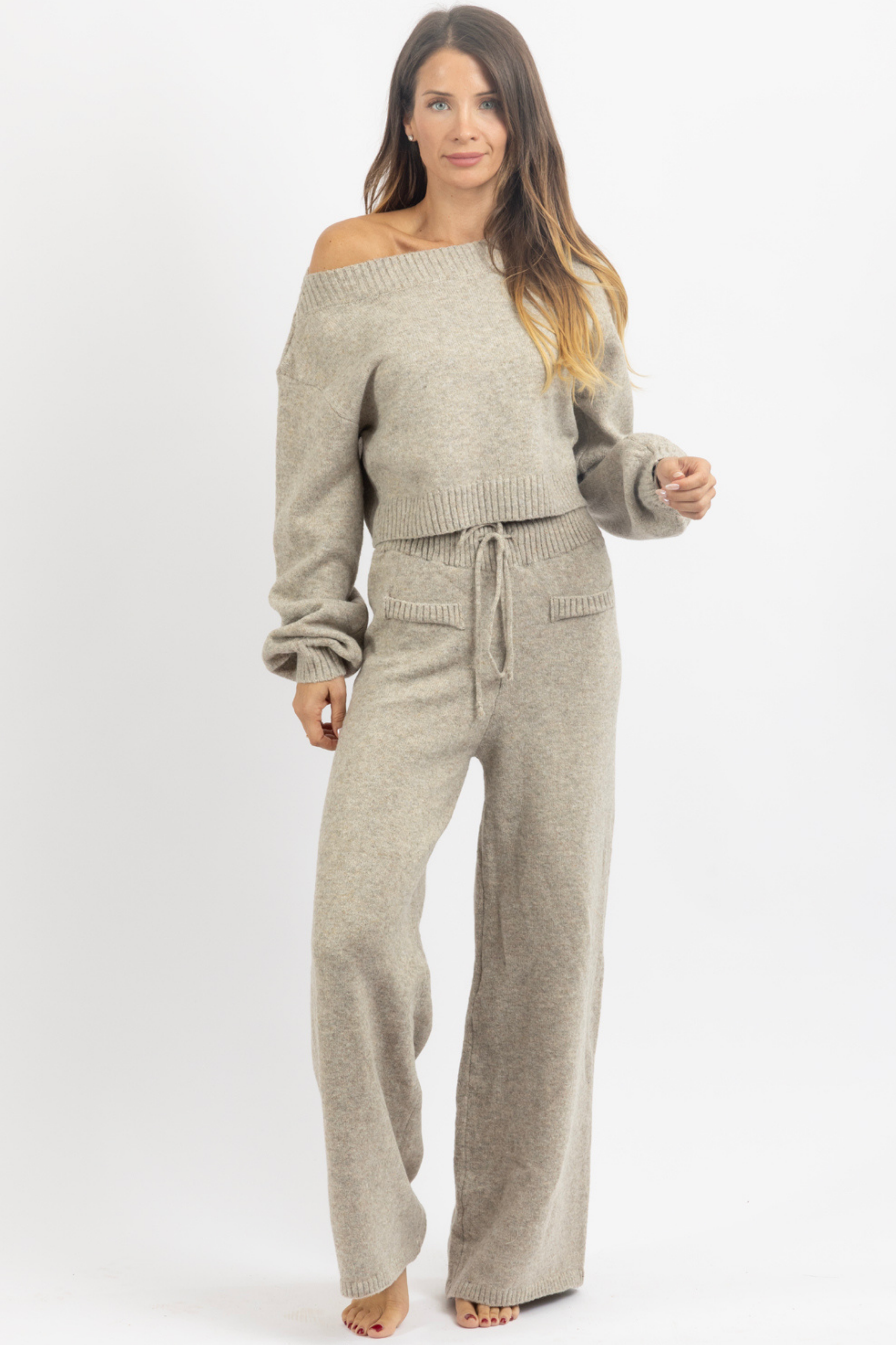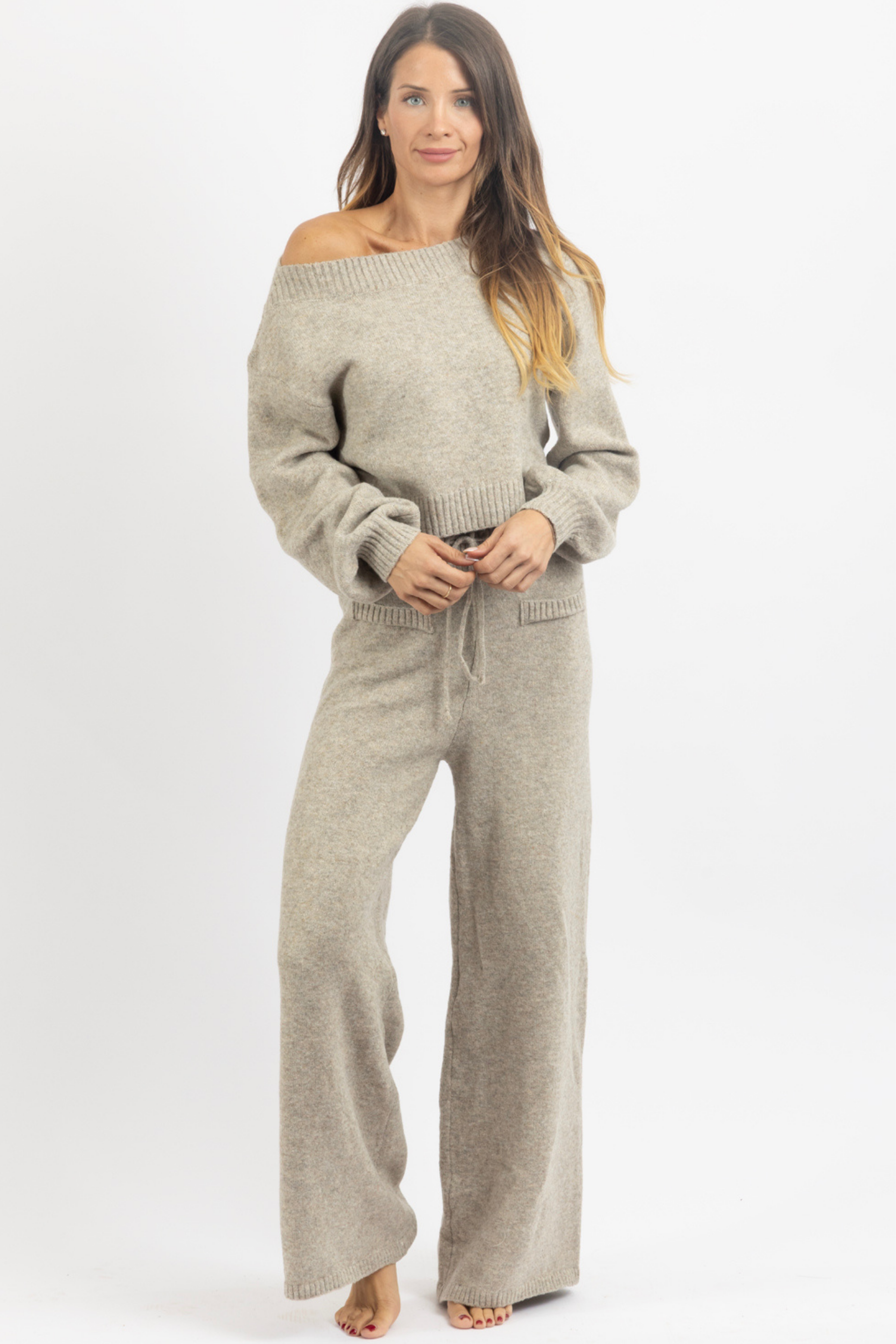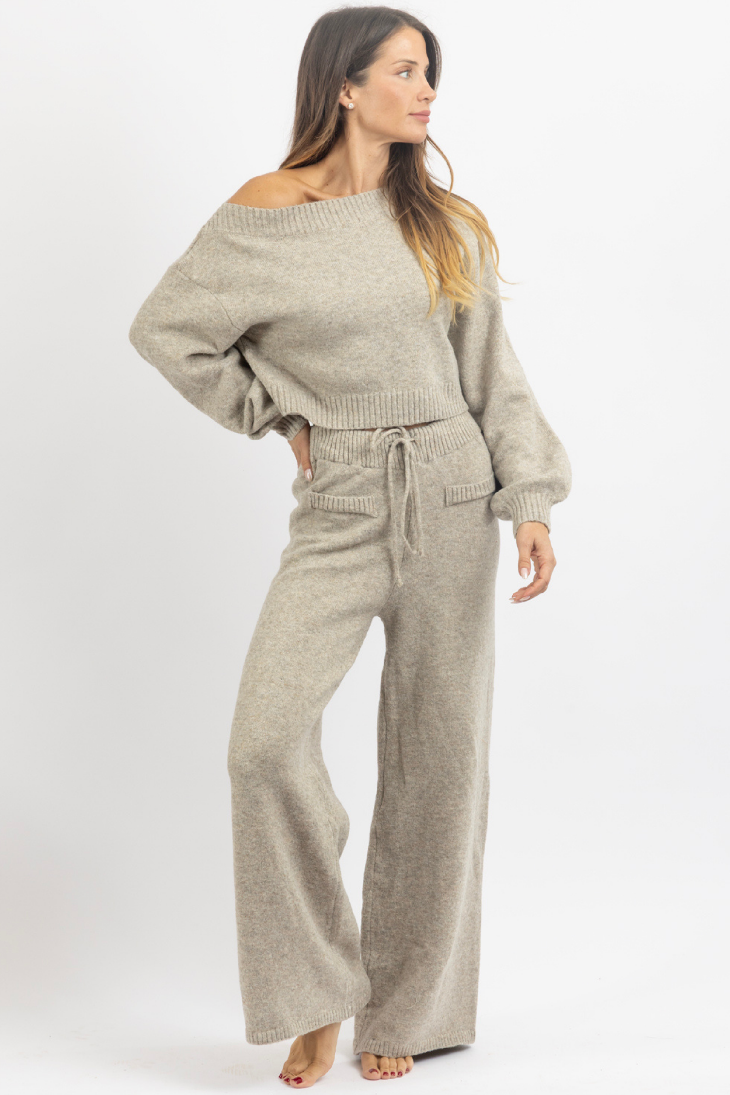Sold together, Off the shoulder knit top, Long sleeves, Balloon sleeve, High rise pant with drawstring waist, Relaxed fit, Flare leg