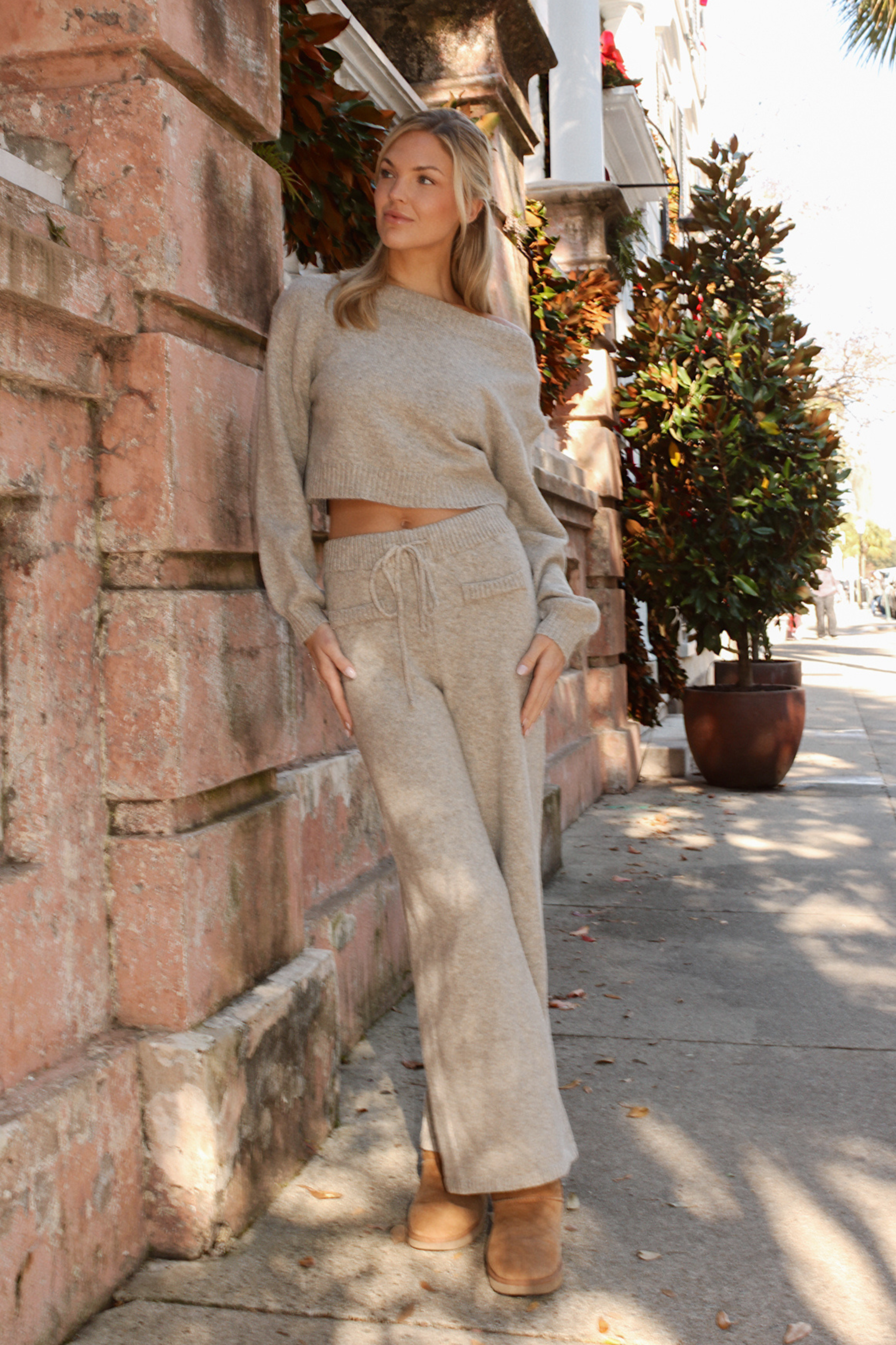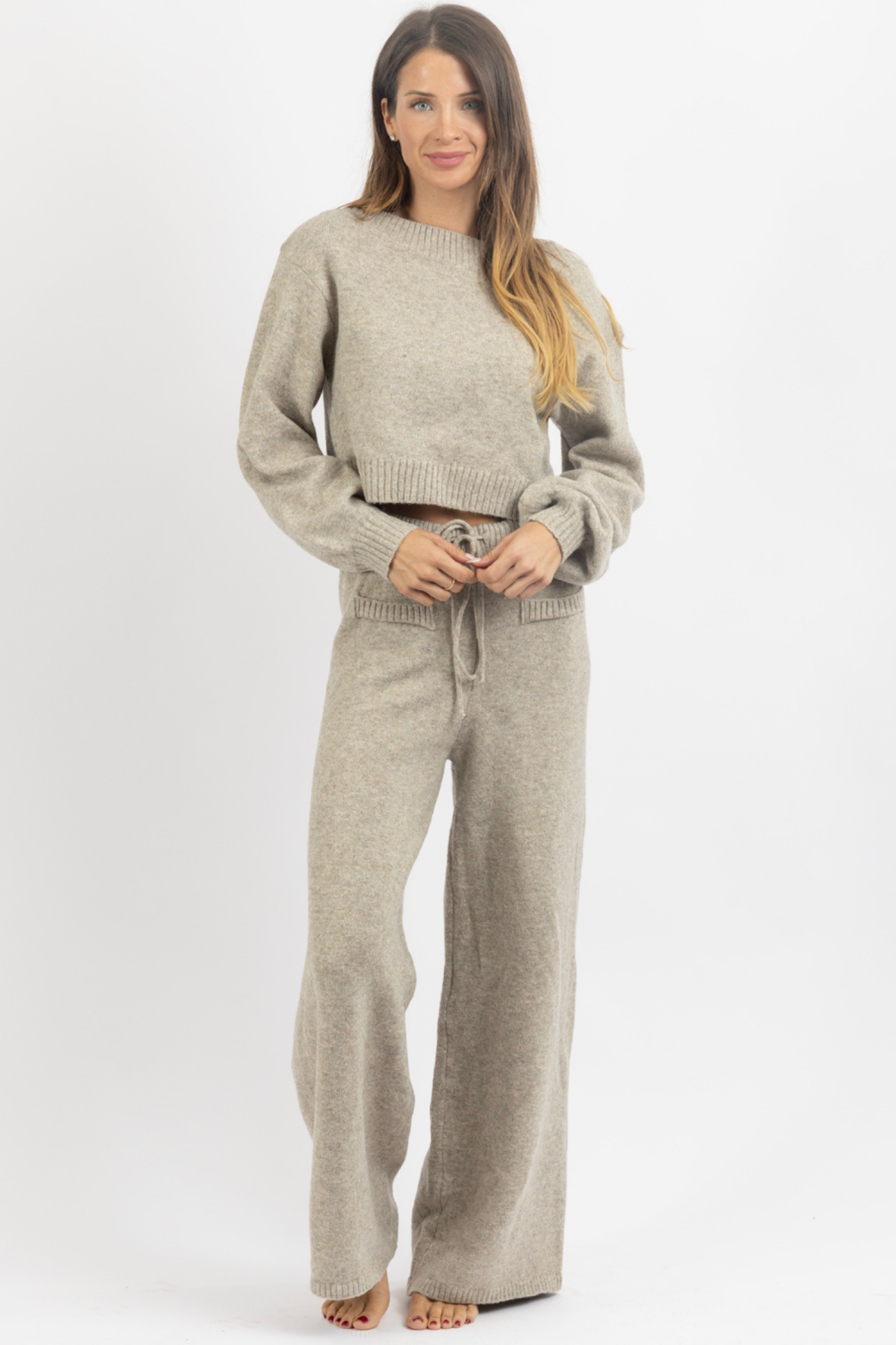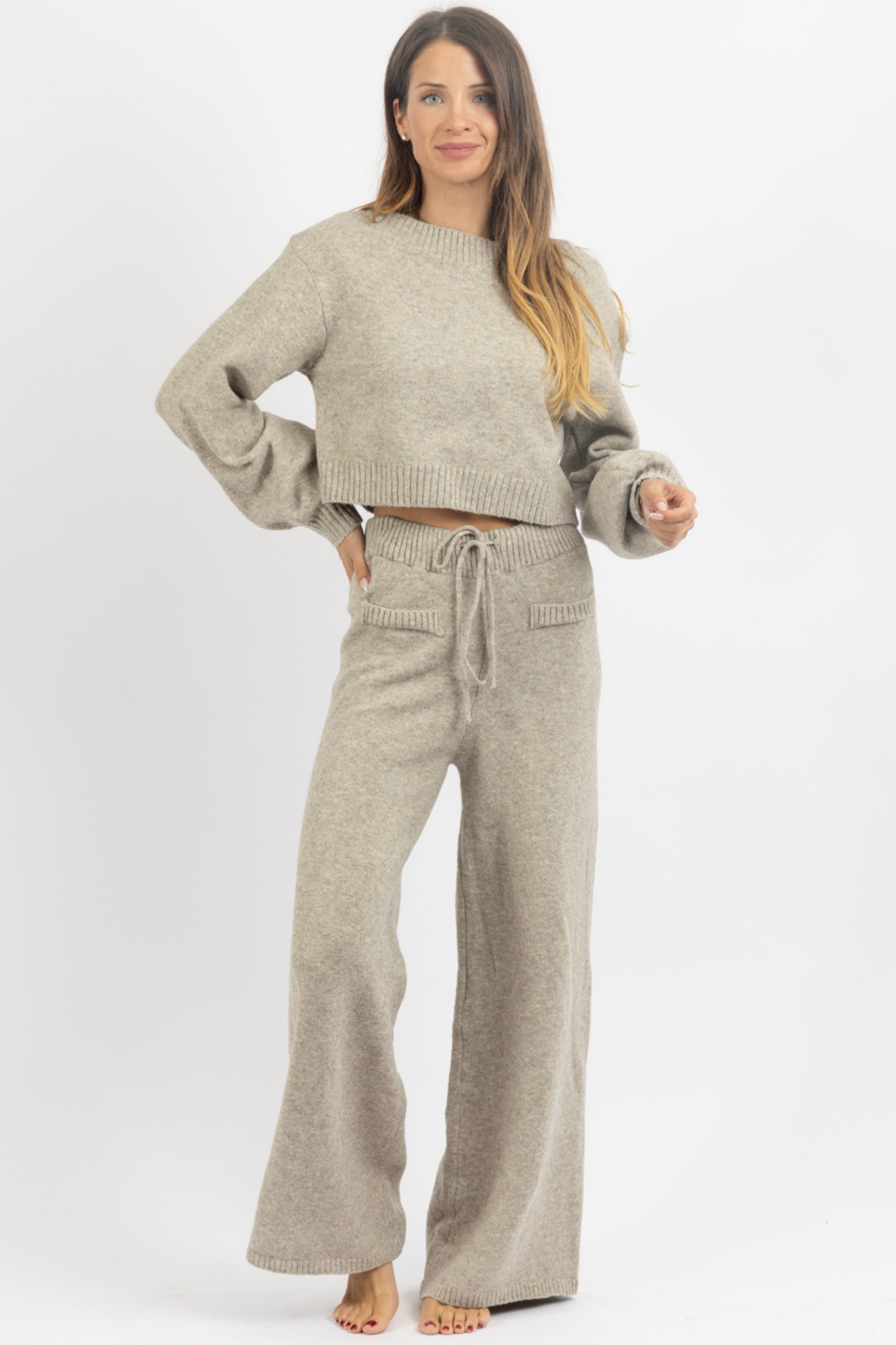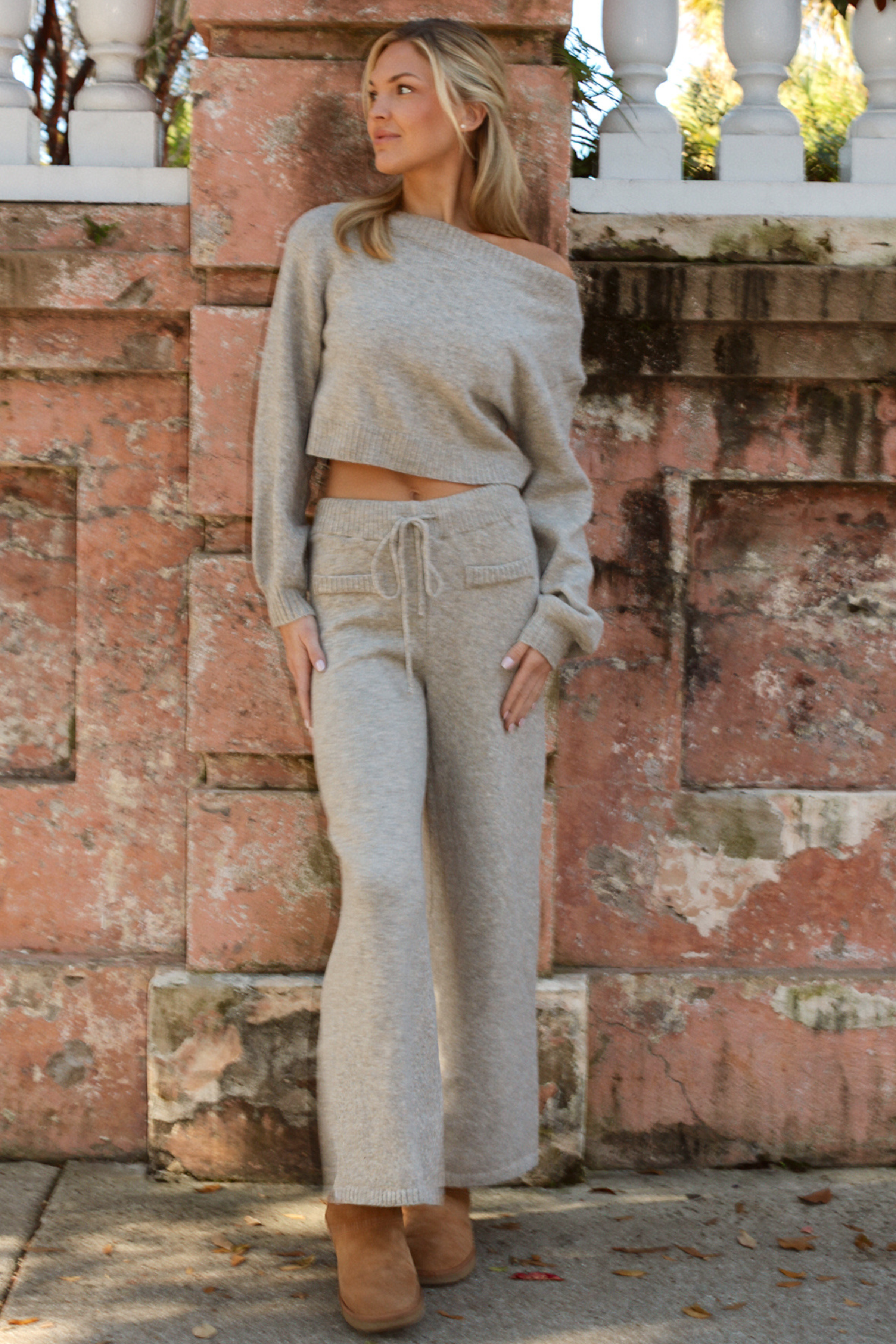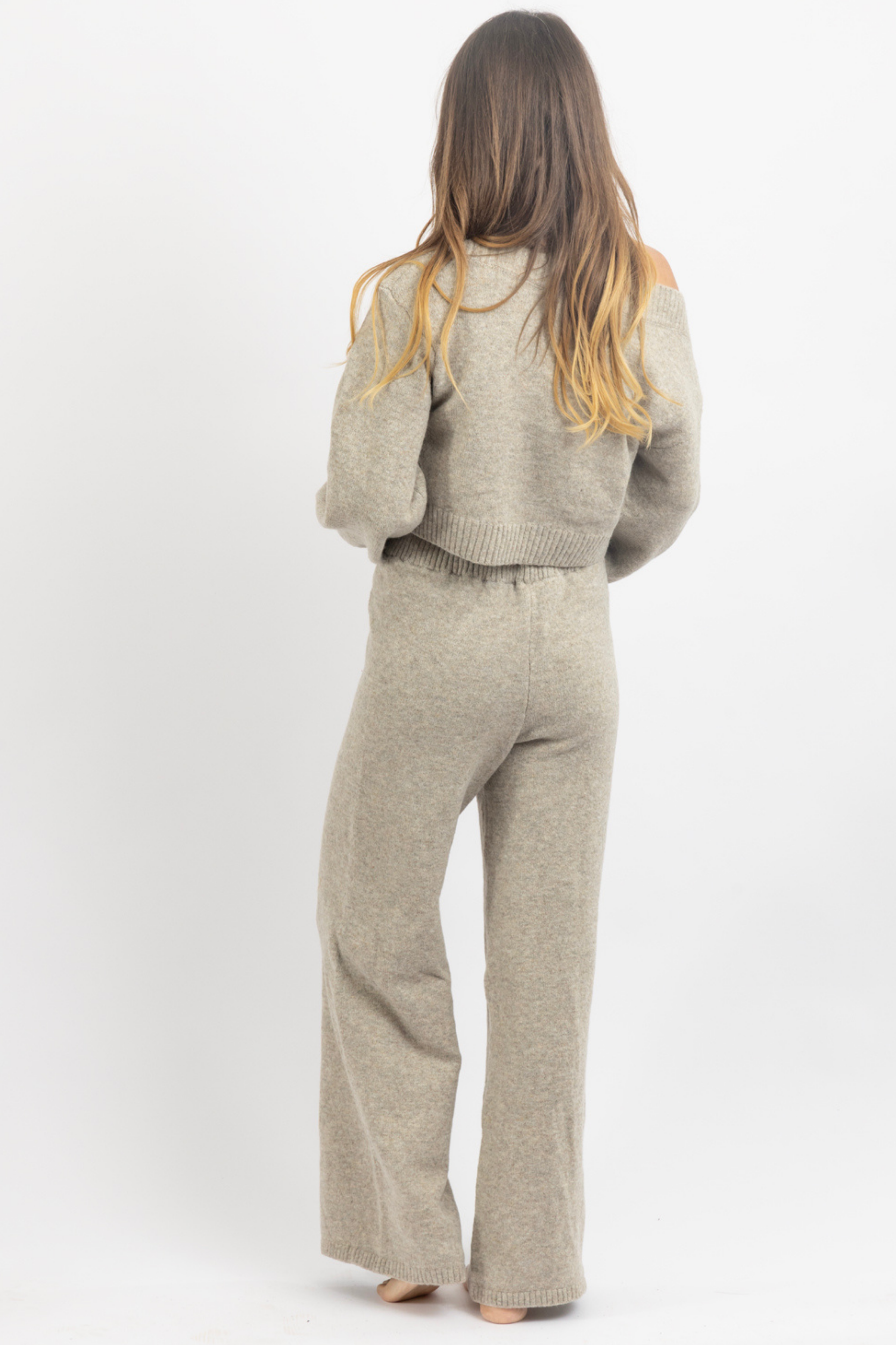 Sold together, Off the shoulder knit top, Long sleeves, Balloon sleeve, High rise pant with drawstring waist, Relaxed fit, Flare leg