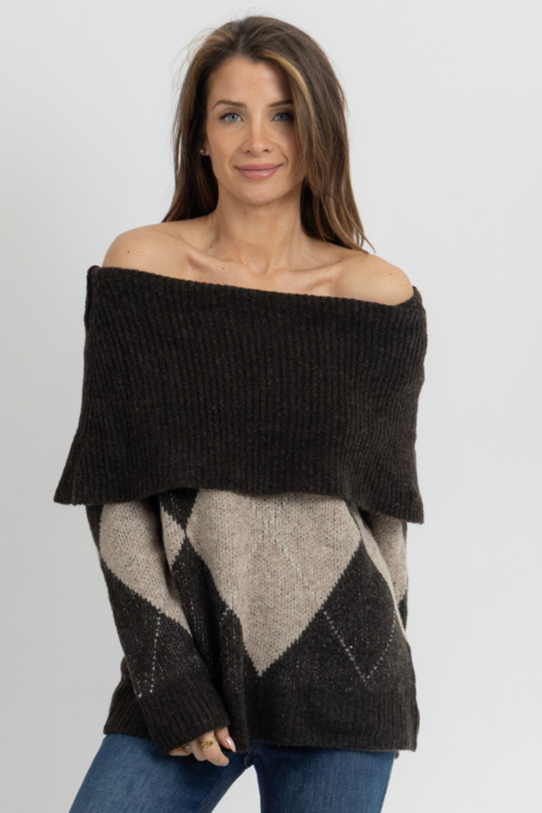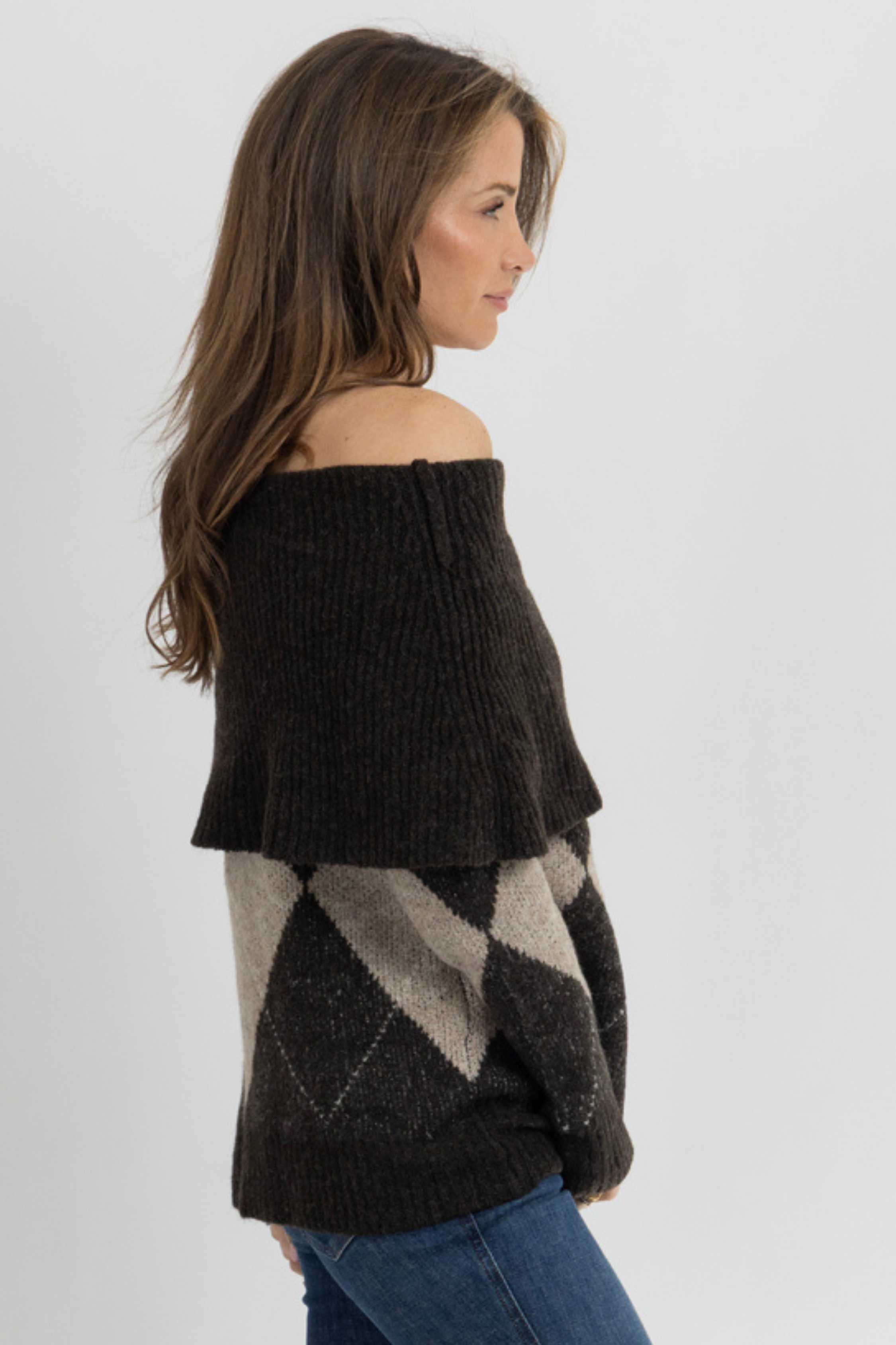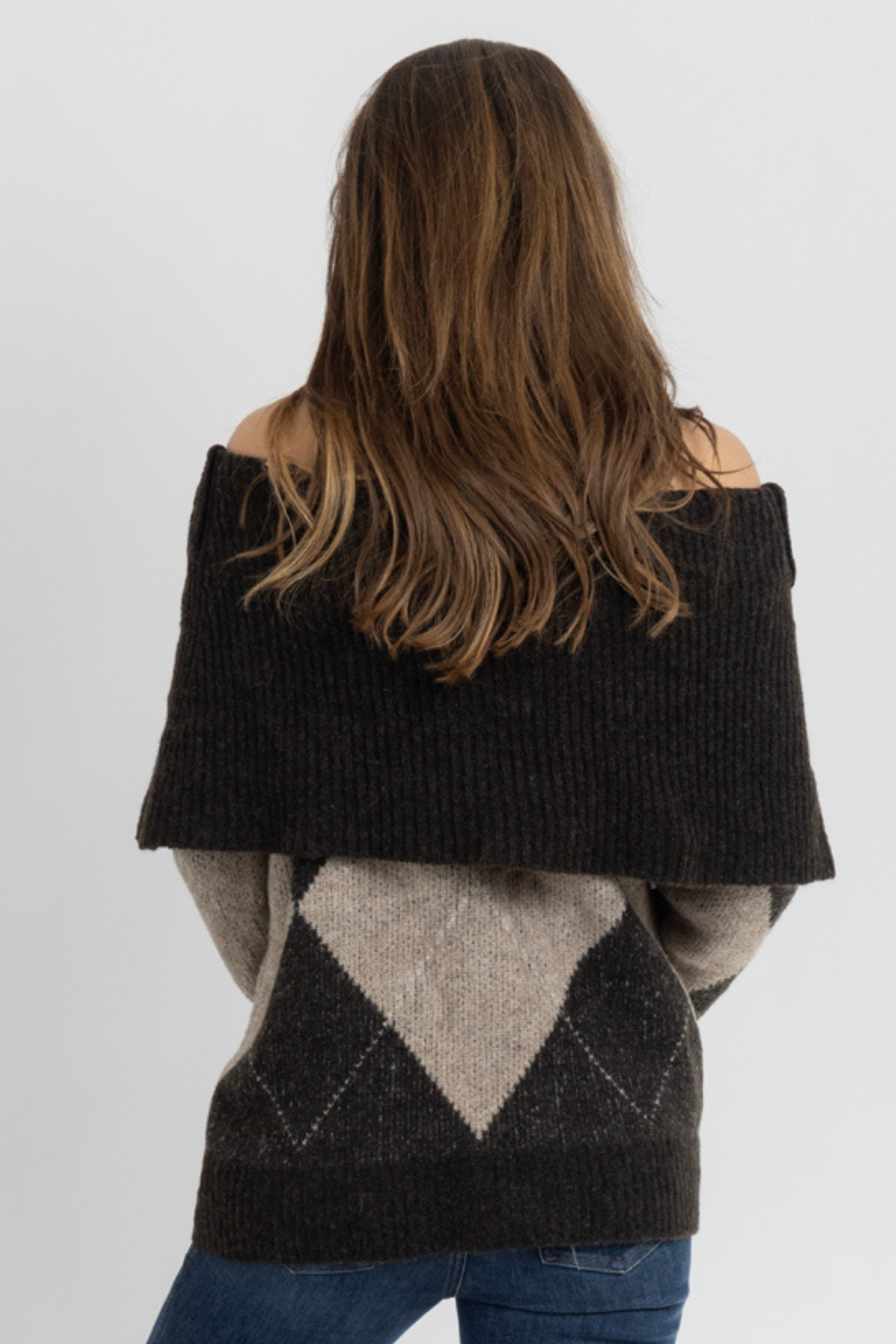 Off the shoulder, Long sleeve, Diamond pattern, Relaxed fit, Neutral two tone