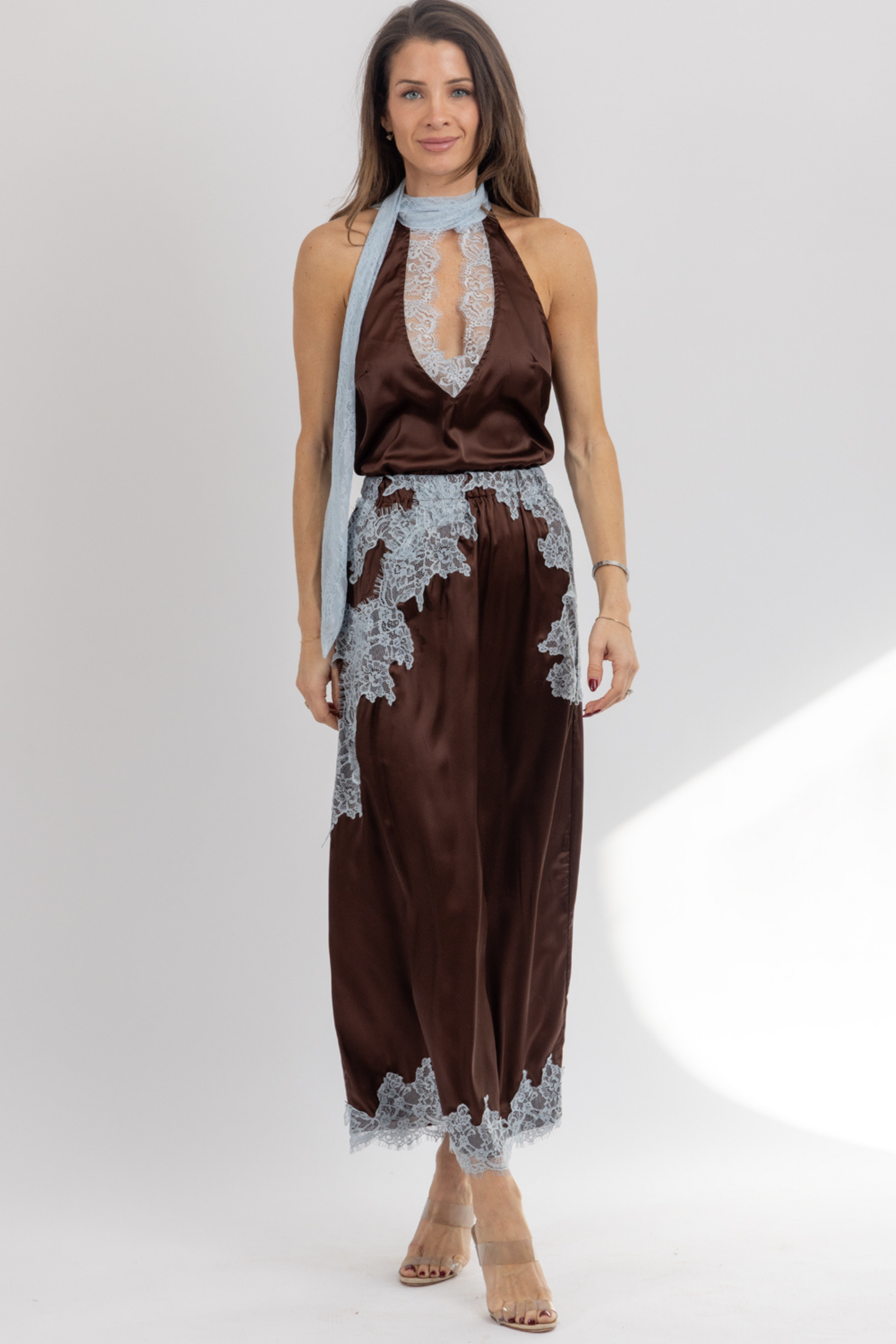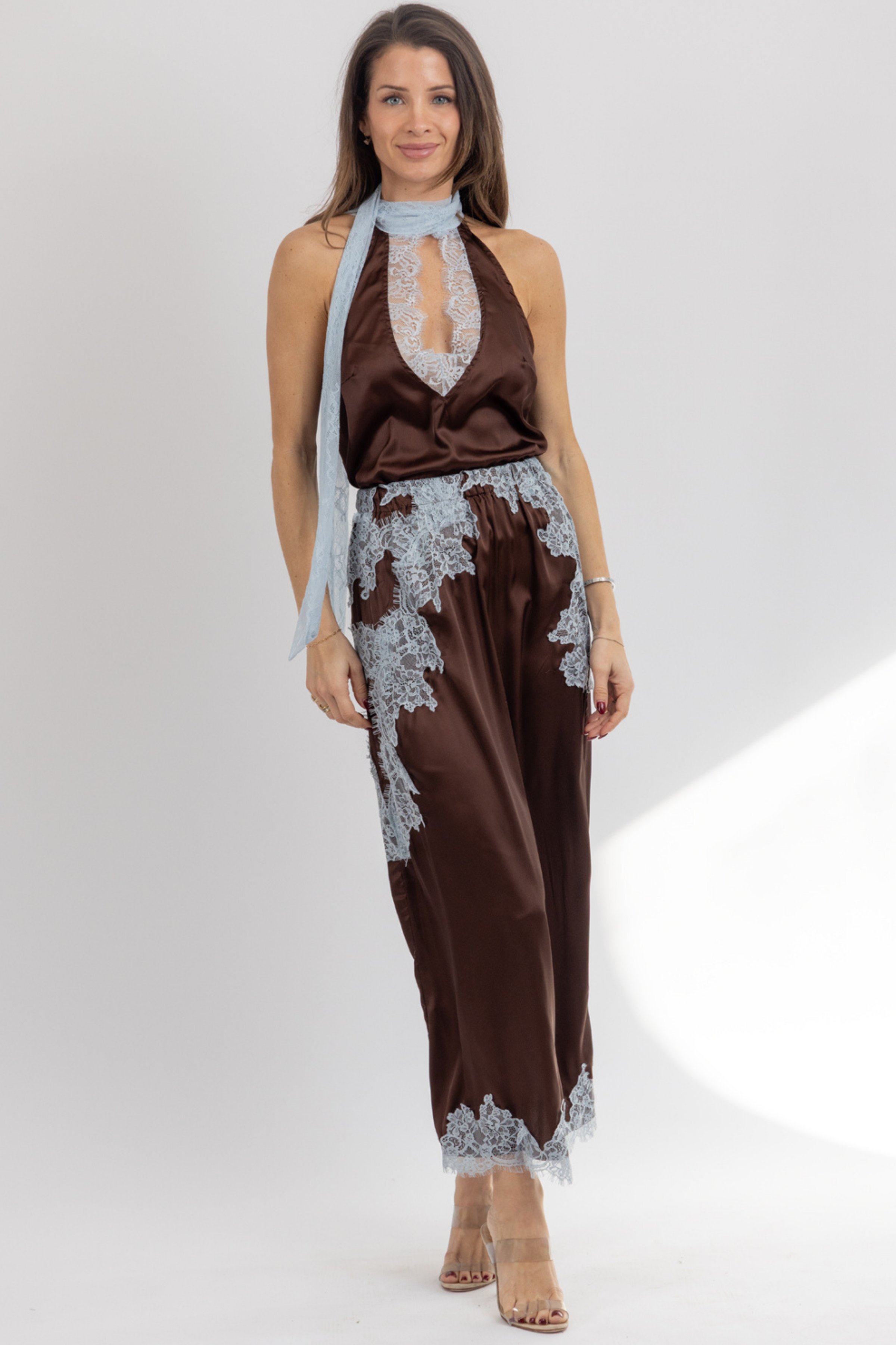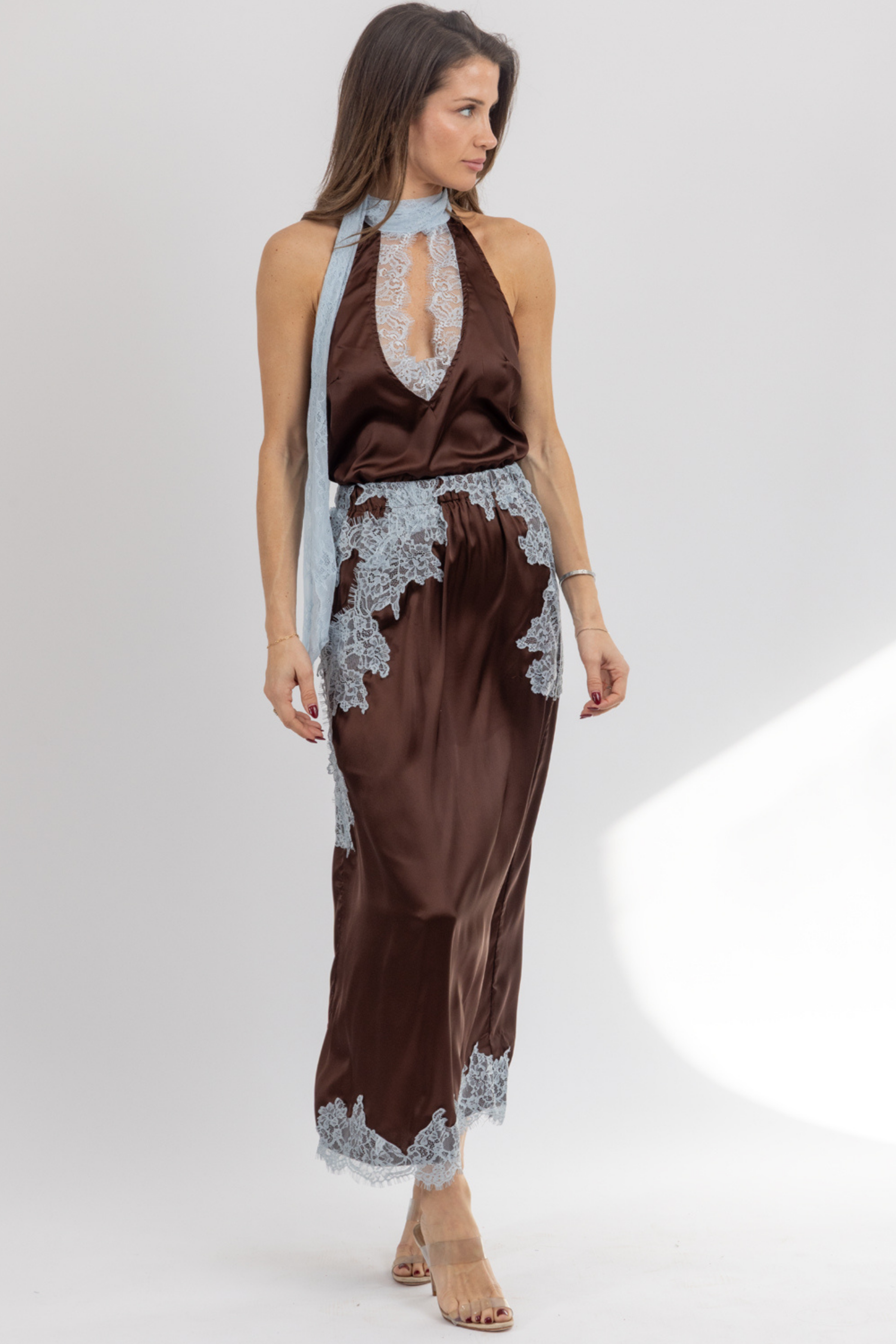 Sleeveless, Scarf detail neckline, Lace trim detail, Sold together