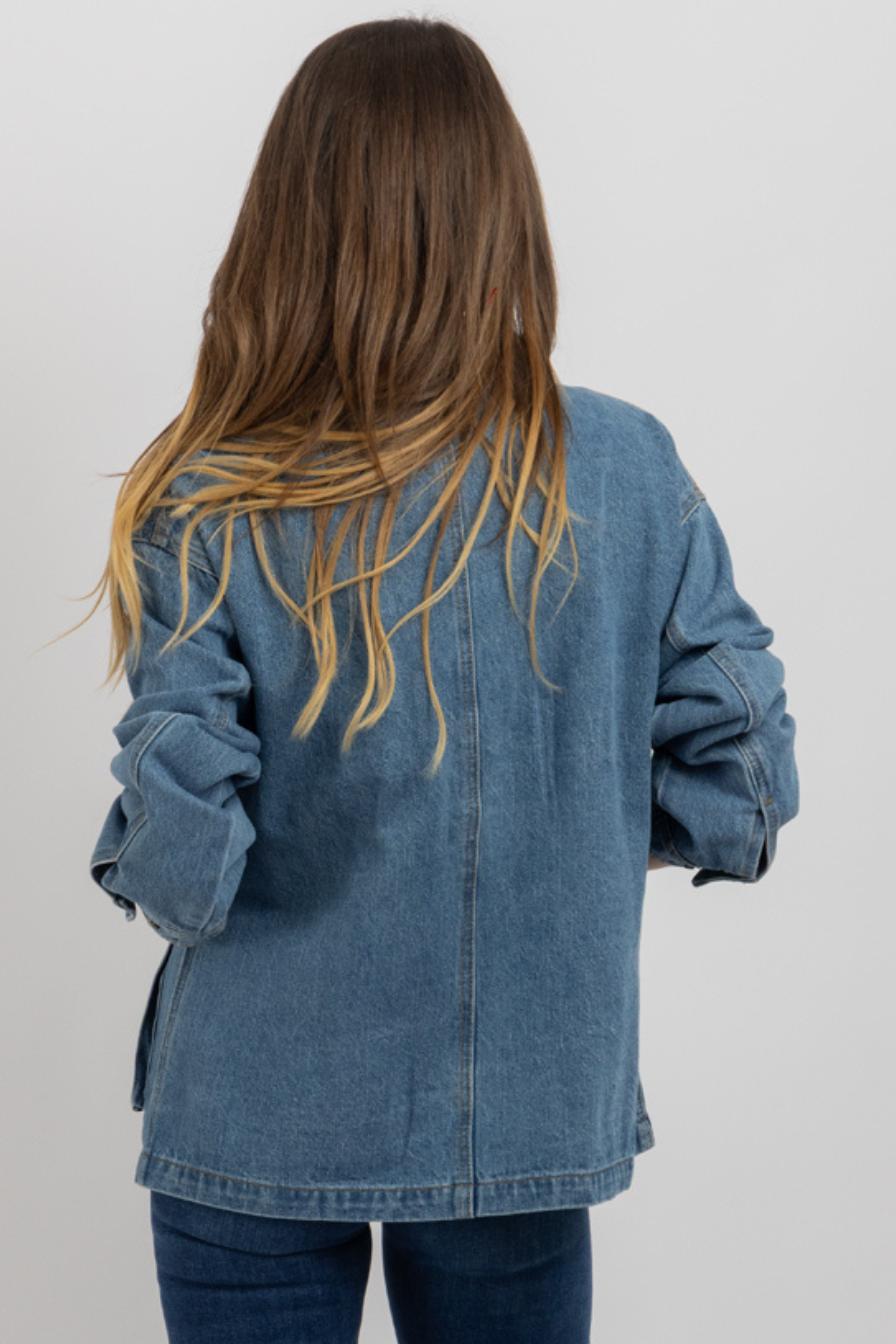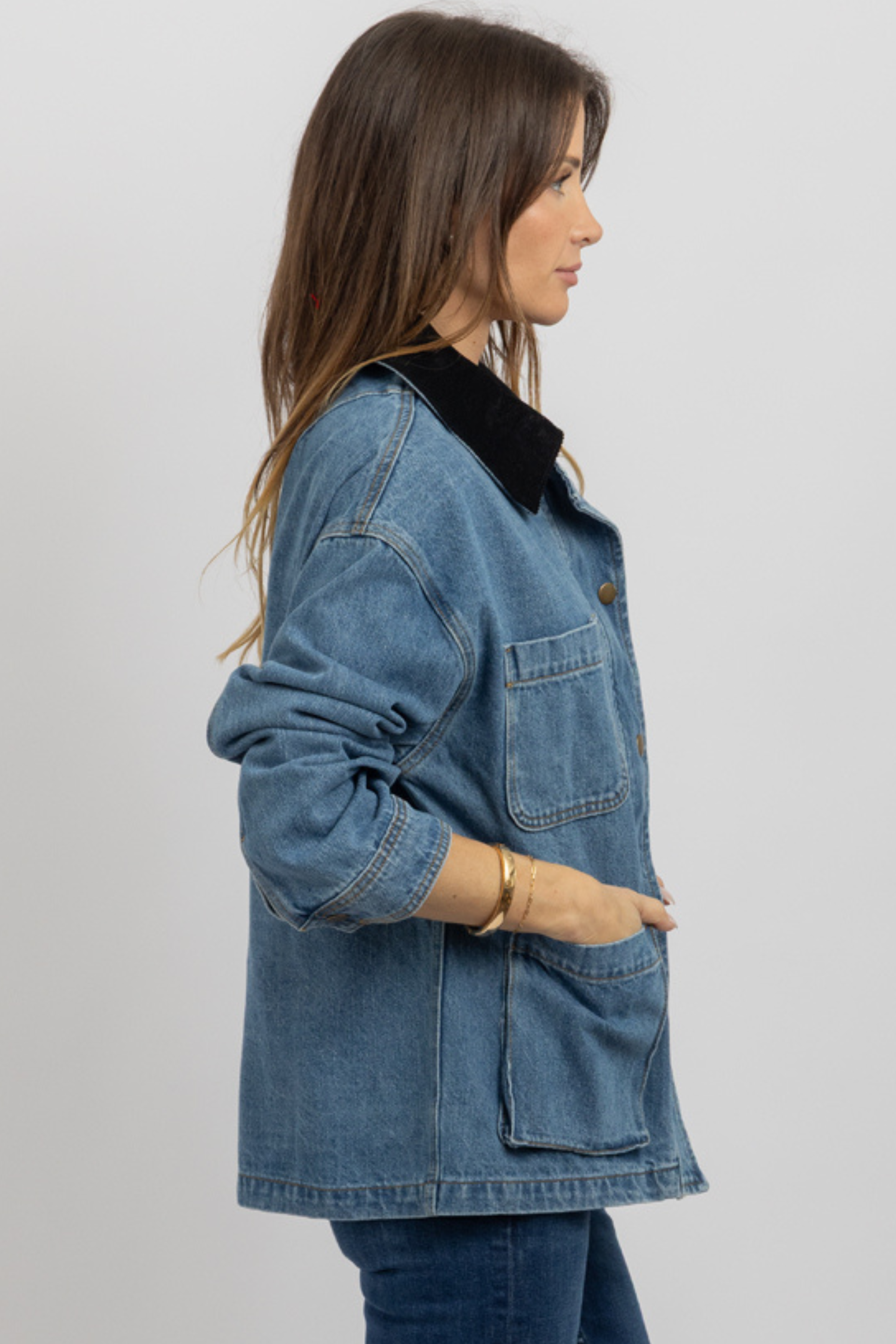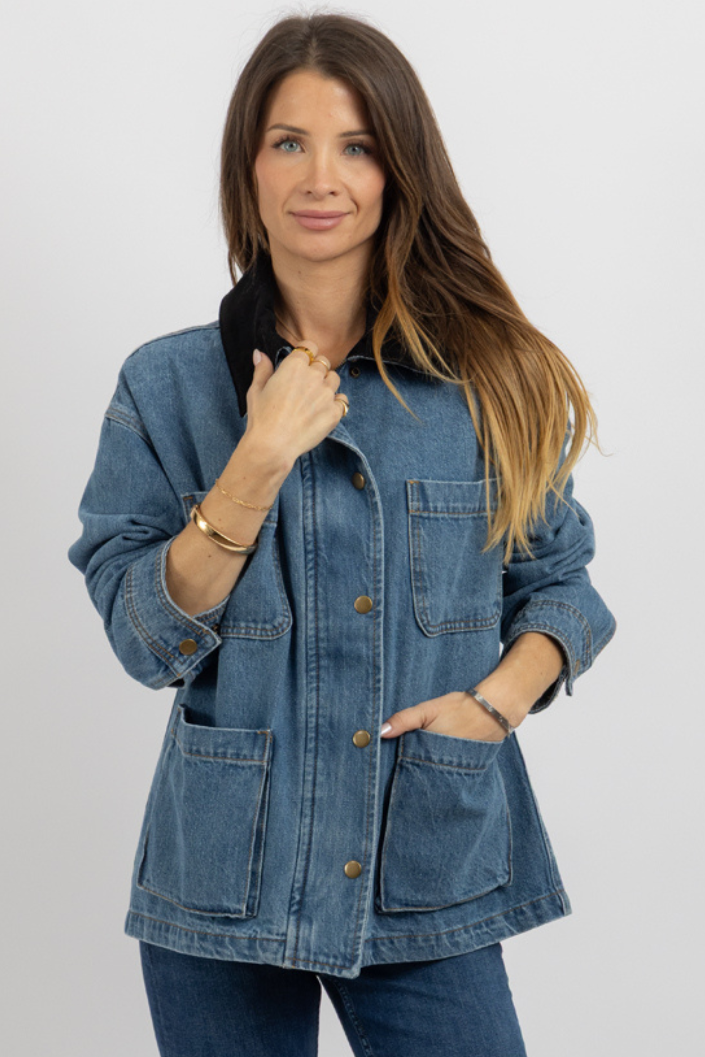 Oversized fit, Contrast corduroy collar, Button front detail, Front pockets, Utility jacket