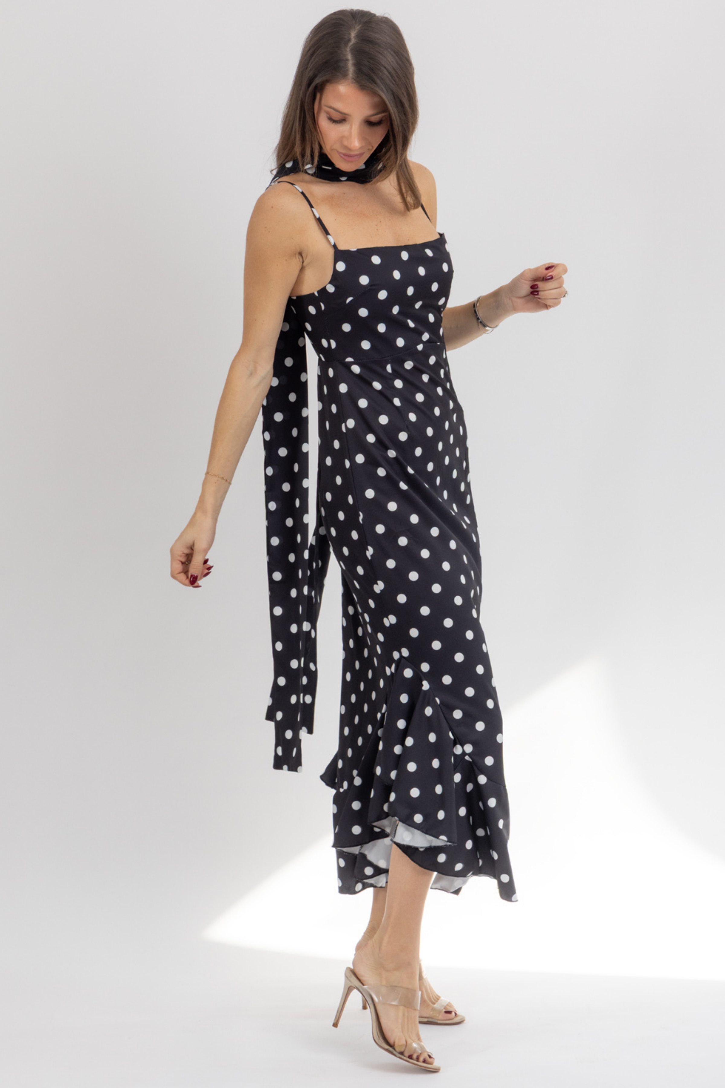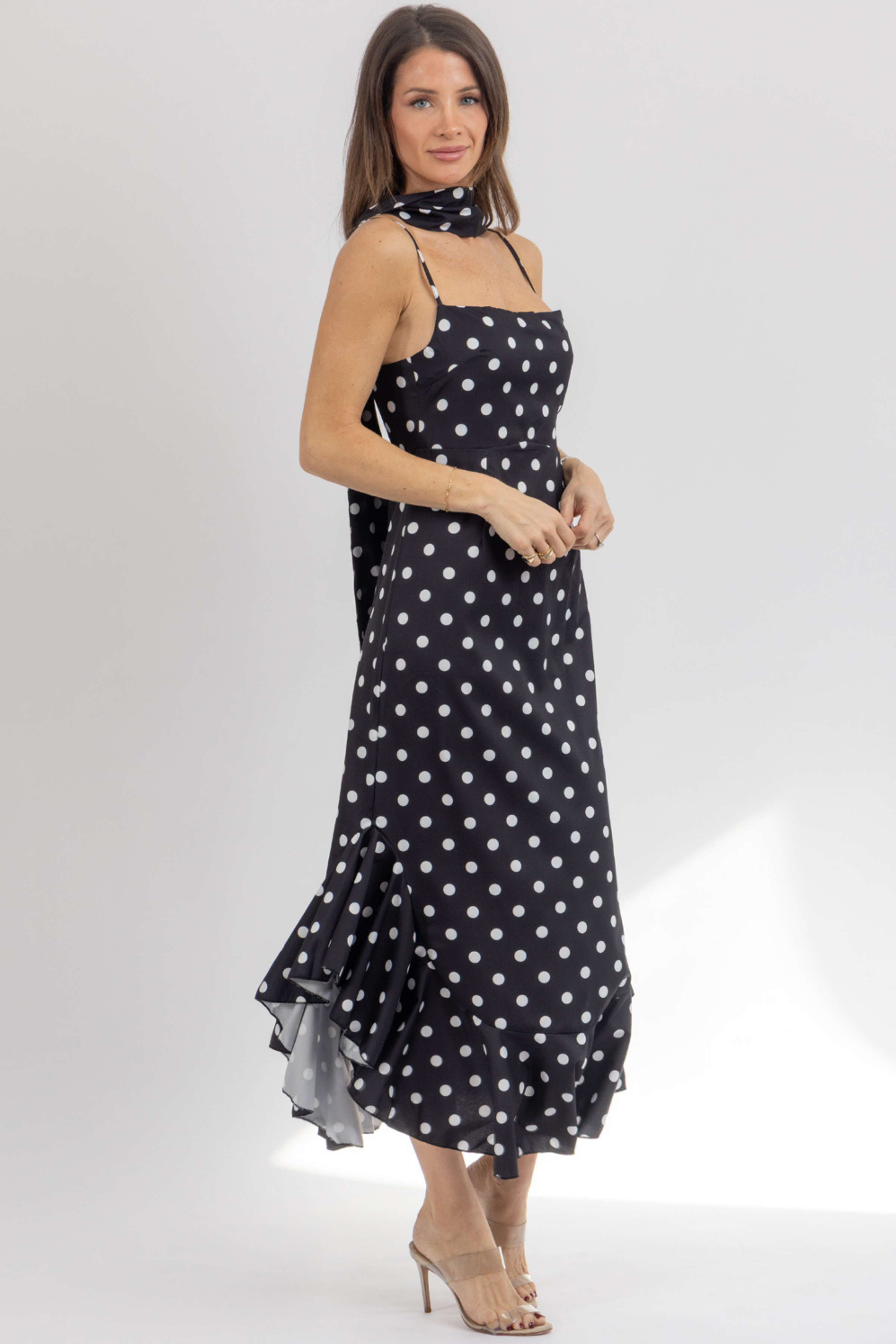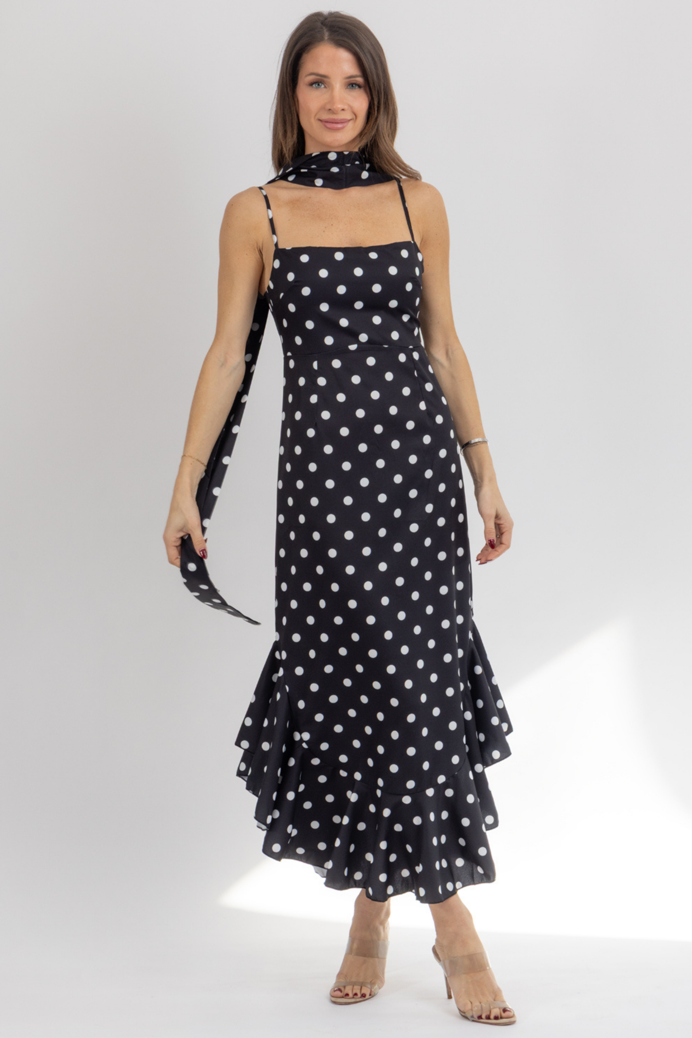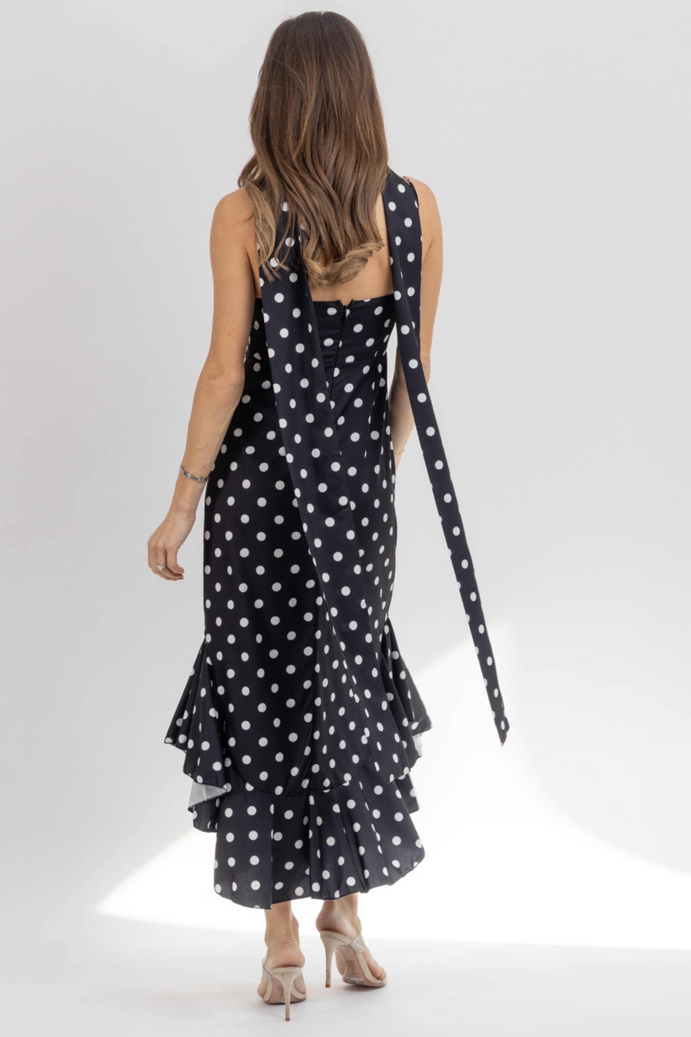 Maxi length, Sleeveless, Sash neckline, Polka dot print